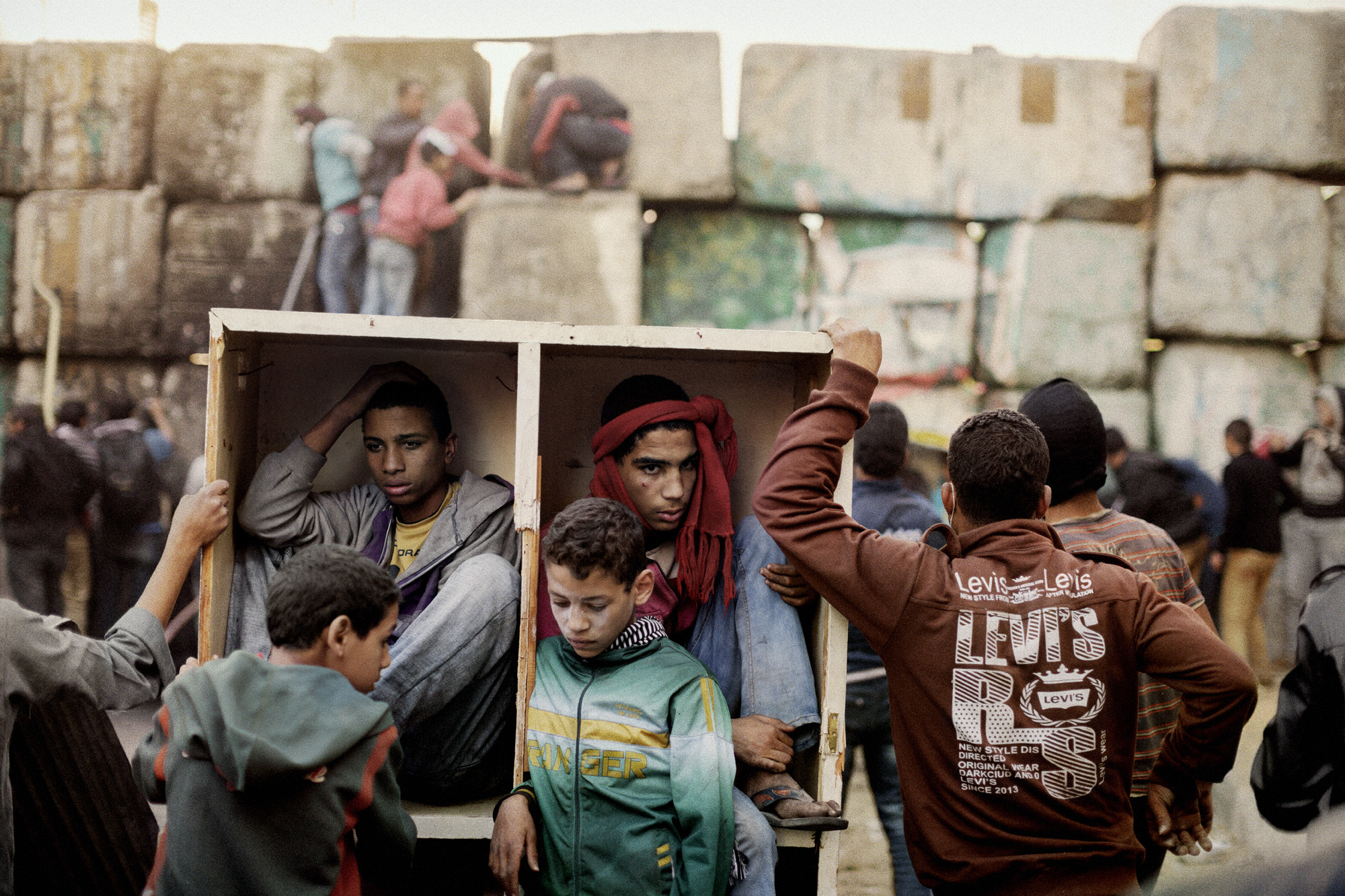 Casi cada día había enfrentamientos en la plaza de Tahrir. La mayoría de los manifestantes que había ese día cerca de la plaza tenían de nueve a trece años. Habían instalado una especie de barricada para protegerse de los combates. Ellos tiraban piedras a través del muro y luego se escondían. Este es un momento en que están cansados y se sientan. Es un momento lírico dentro del caos.