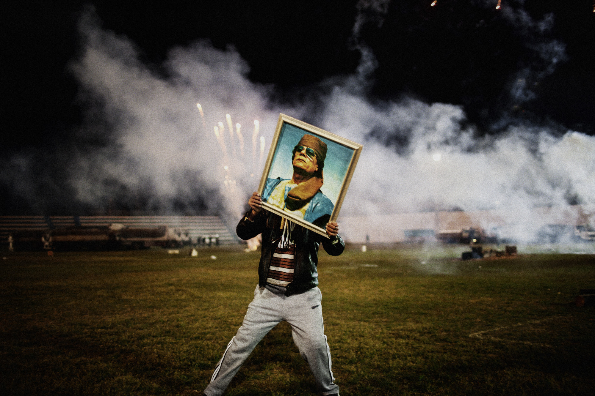 4. Un simpatizante de Gadafi sujeta un retrato del líder libio durante la celebración, frente a periodistas extranjeros, de un avance militar del régimen. Zawiyah (Libia). Marzo de 2011.