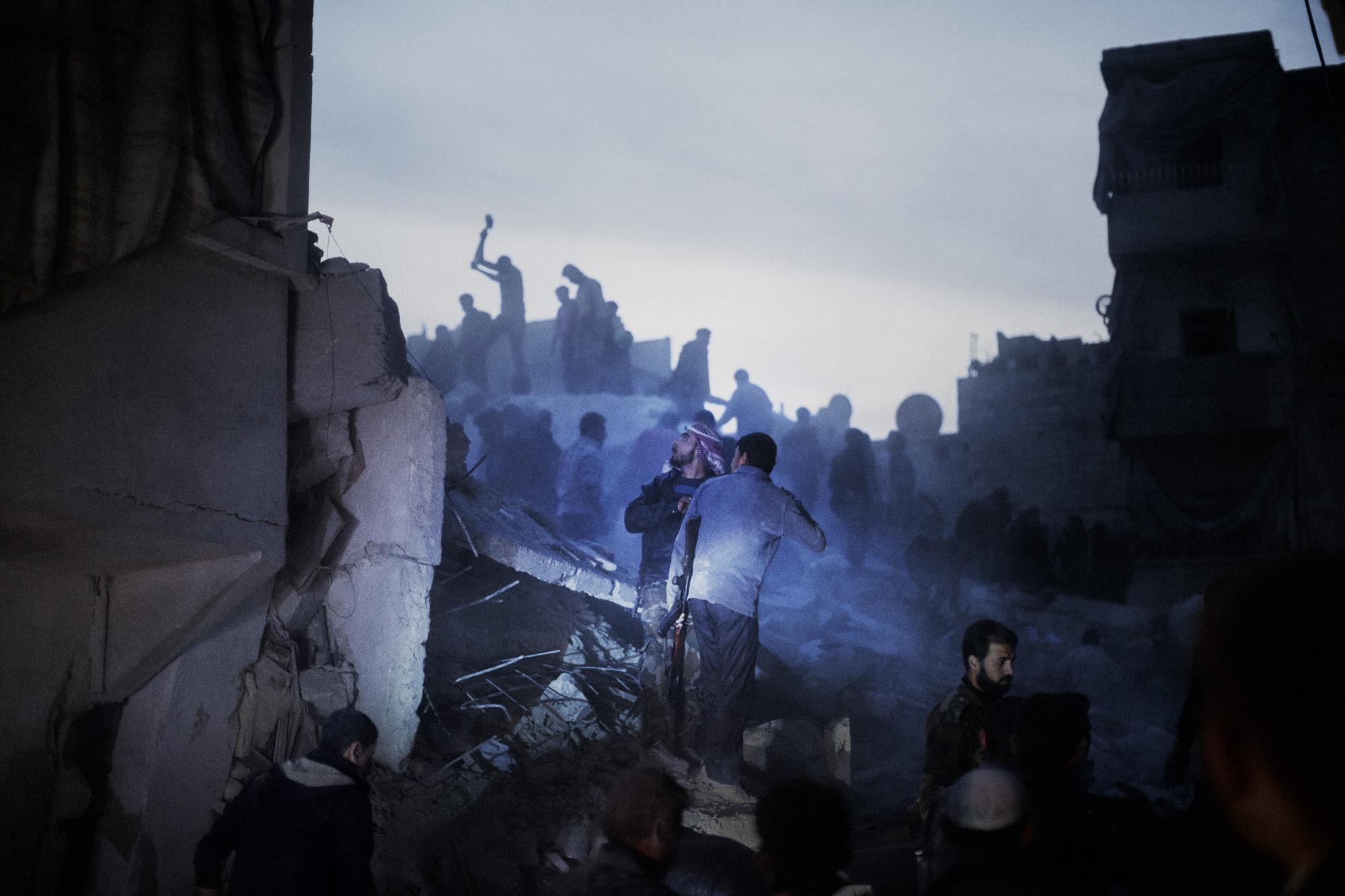 7. Búsqueda de supervivientes bajo las ruinas tras un bombardeo del régimen sirio en un barrio controlado por los rebeldes. Alepo (Siria). Marzo de 2013.