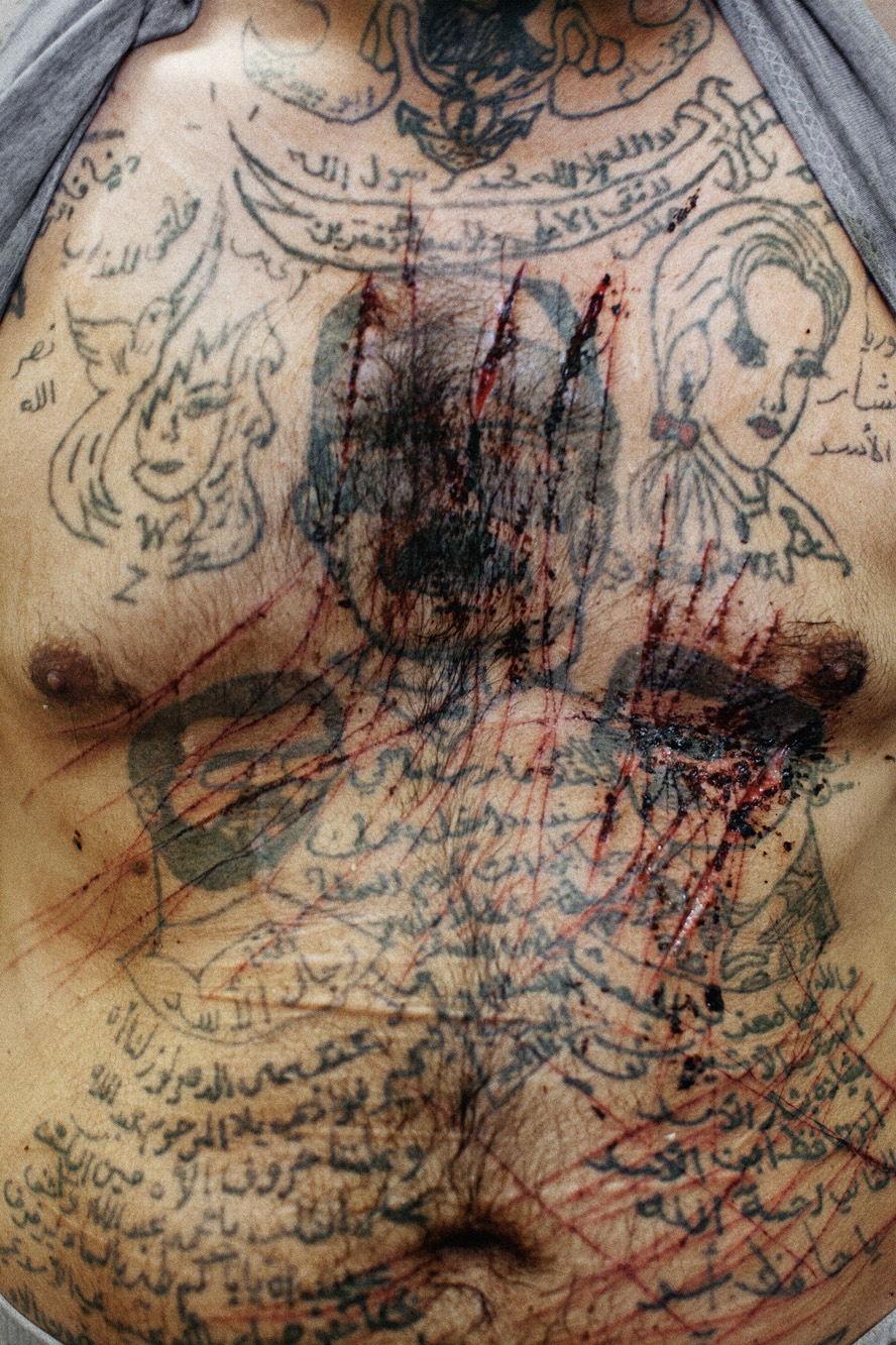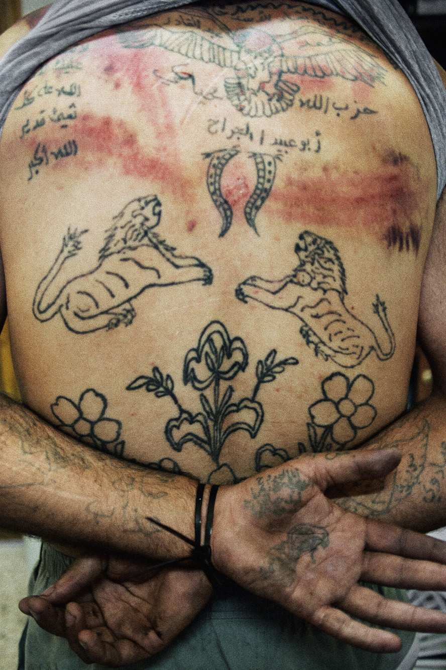 8 y 9. El torso desnudo de Zakariya Gazmouz, supuesto miembro de una milicia afín al régimen sirio, cubierto por tatuajes pro-Asad que ha intentado borrar con una cuchilla al ser encarcelado por los rebeldes.