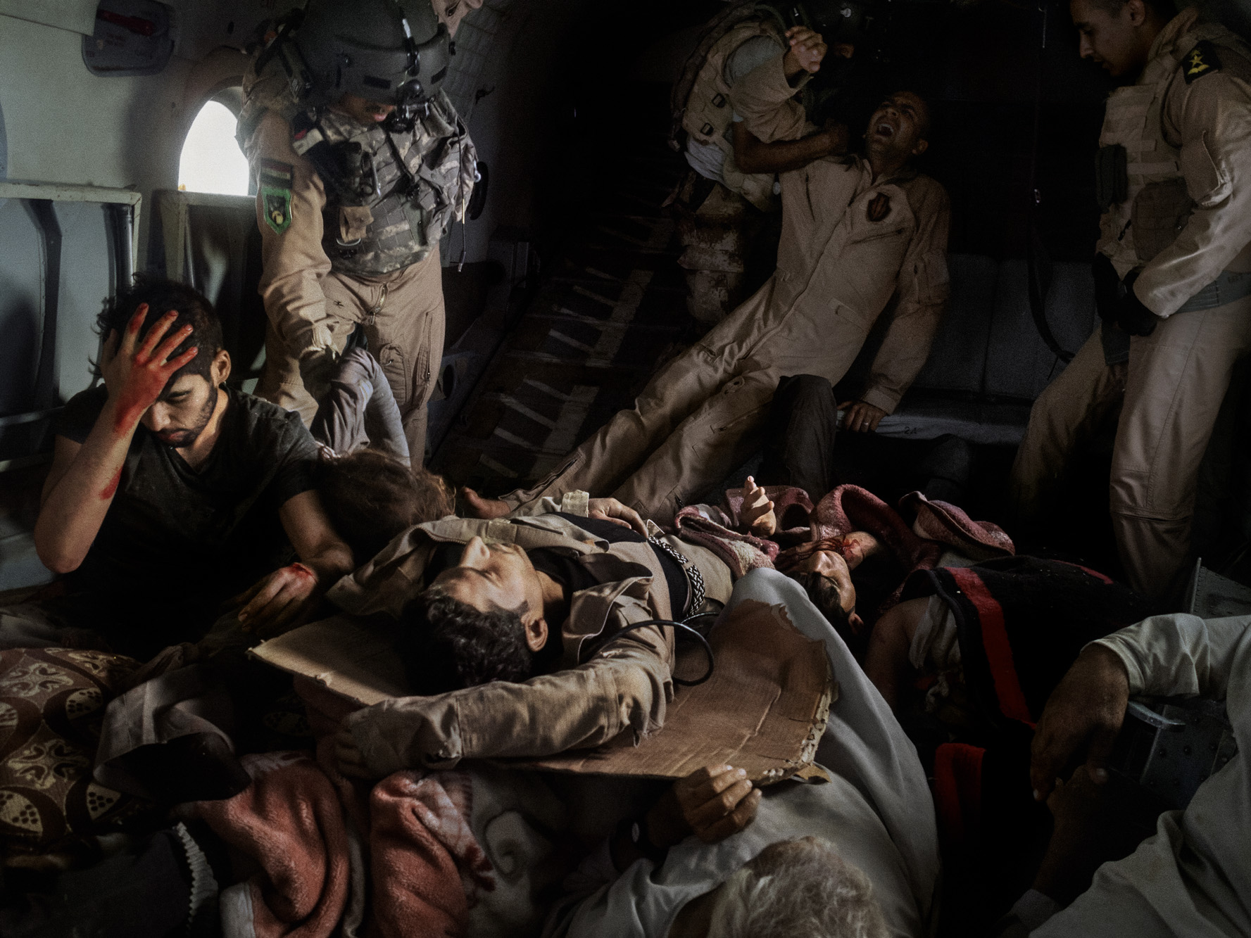 10. Supervivientes heridos tras un accidente de helicóptero son evacuados por un helicóptero iraquí de rescate. Sinjar (Irak). Agosto de 2014.