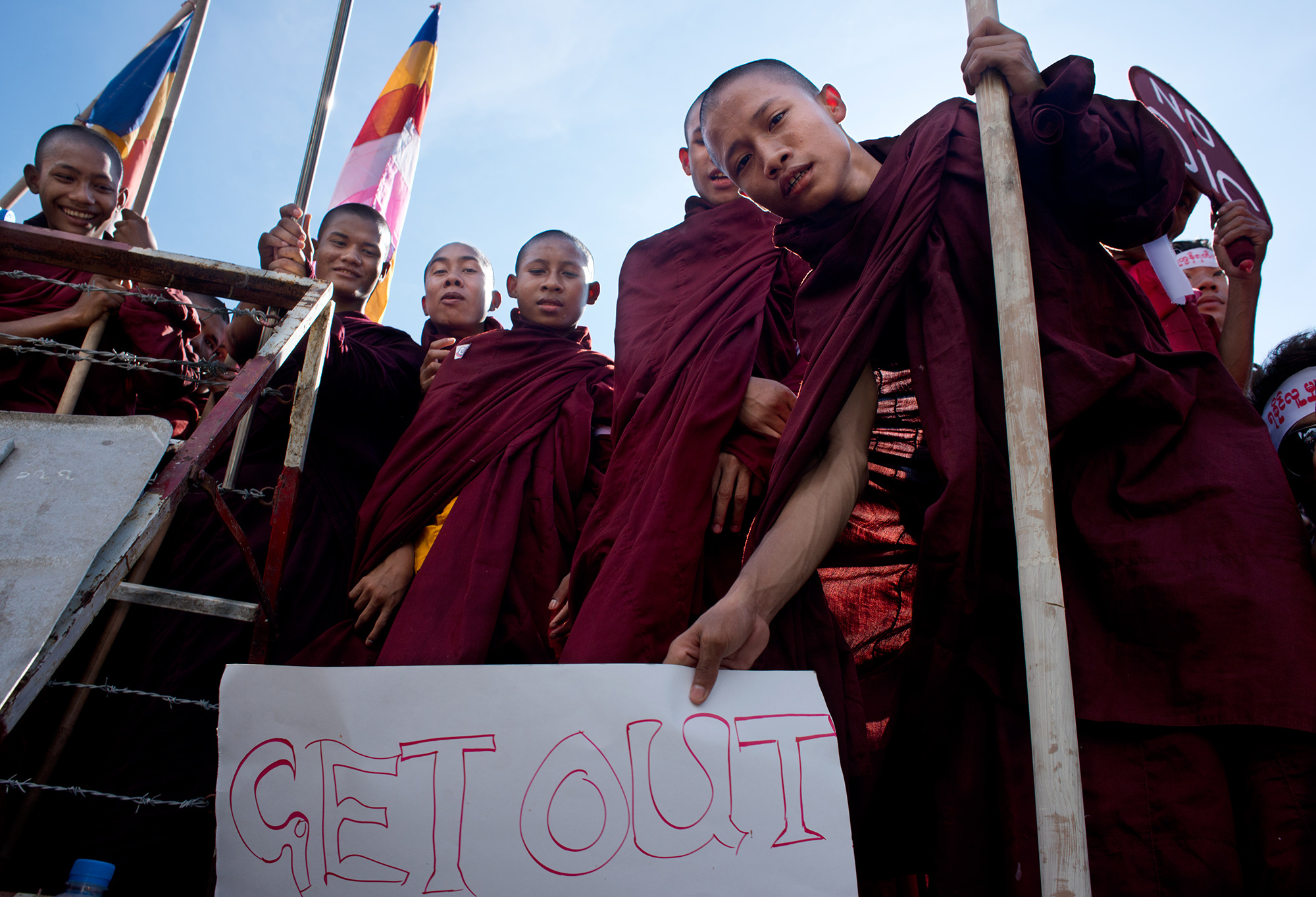“El movimiento 969 [que fue oficialmente ilegalizado y cuyos miembros se han integrado en el Ma Ba Tha, las Asociación para la Protección de la Raza y la Religión] nace como respuesta a la invasión musulmana que sufre Birmania, y nuestro objetivo es defender al país de ella”, asegura Wirathu mientras se coloca bien la túnica naranja y sorbe un zumo de frutas. “Nosotros no tenemos fusiles, no estamos detrás de ningún acto violento, solo queremos evitar que los musulmanes se hagan con el control del país y dar a conocer la situación actual a nuestros compatriotas”. A su alrededor, el resto de monjes asiente. Juntos han promovido el boicot a los comercios musulmanes y el proyecto de ley que pretende prohibir los matrimonios entre personas de diferente credo.