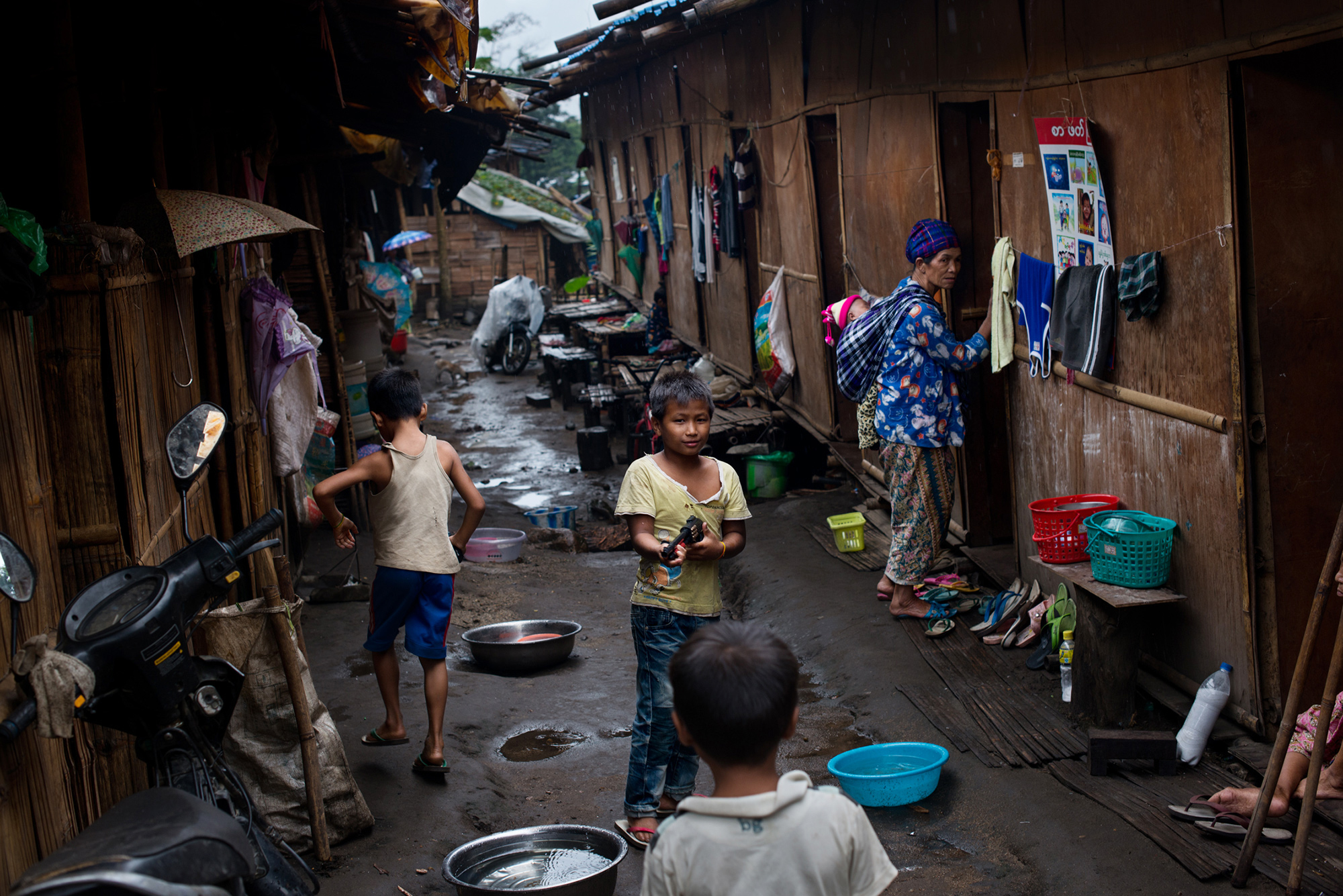 Algo parecido sucede con los desplazados internos. Lahtaw Zan San, uno de ellos, malvive con un sueldo equivalente a 20 euros mensuales. “Y algo de arroz”, dice. Da clases a otros desplazados kachin y comparte choza con seis miembros de su familia. Tres generaciones encerradas en una construcción de madera que se inunda con cada chaparrón. O sea, casi a diario. “Pero es mejor que correr el riesgo de que nos maten los militares. Ahora mismo no podemos regresar a nuestra casa [en el pueblo de Japu], porque las posiciones del Ejército están cerca, y ya sabemos lo que sucede cuando llegan: disparan a la gente y se hacen con todo lo que haya de valor en las casas”, afirma.