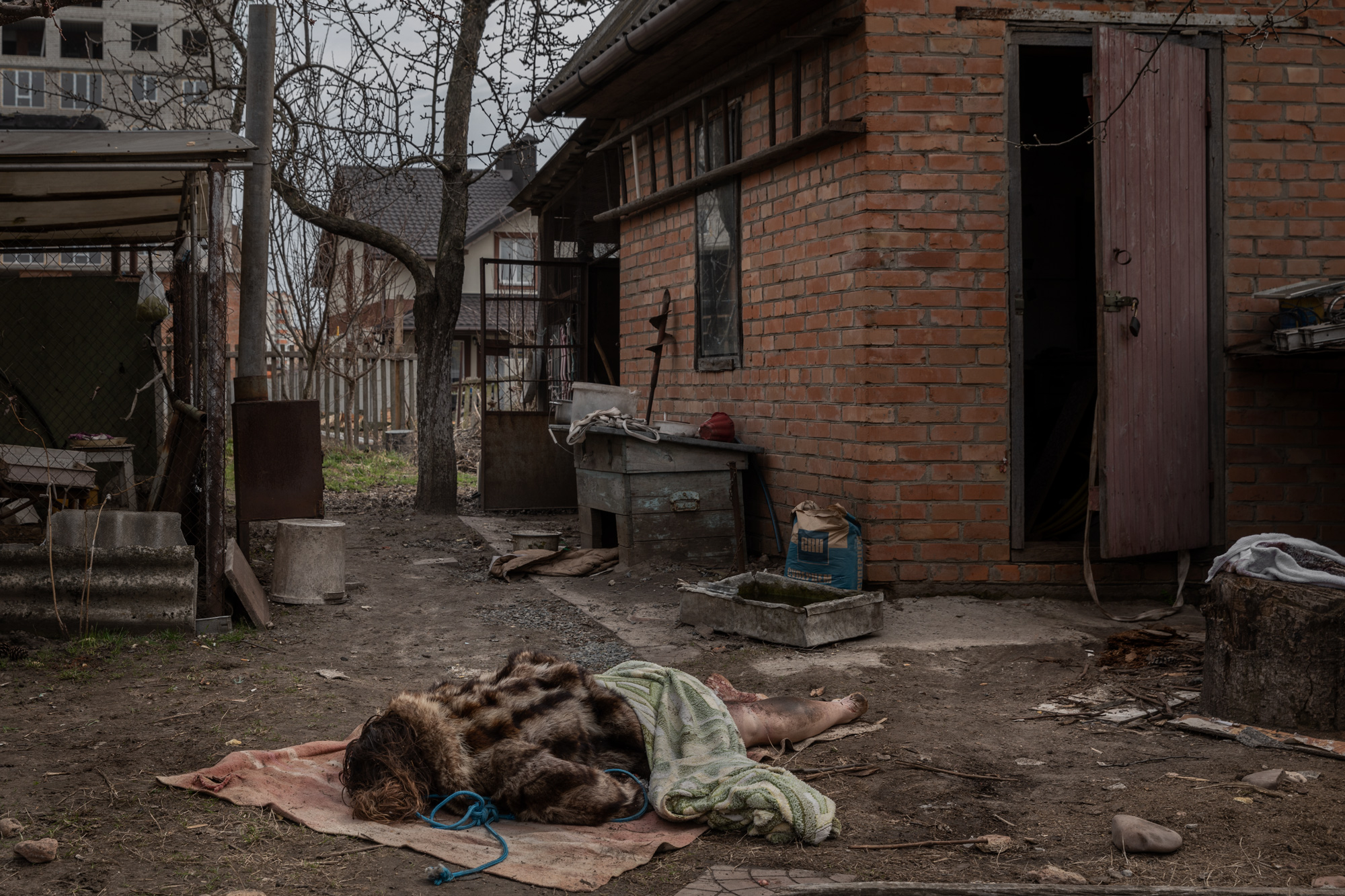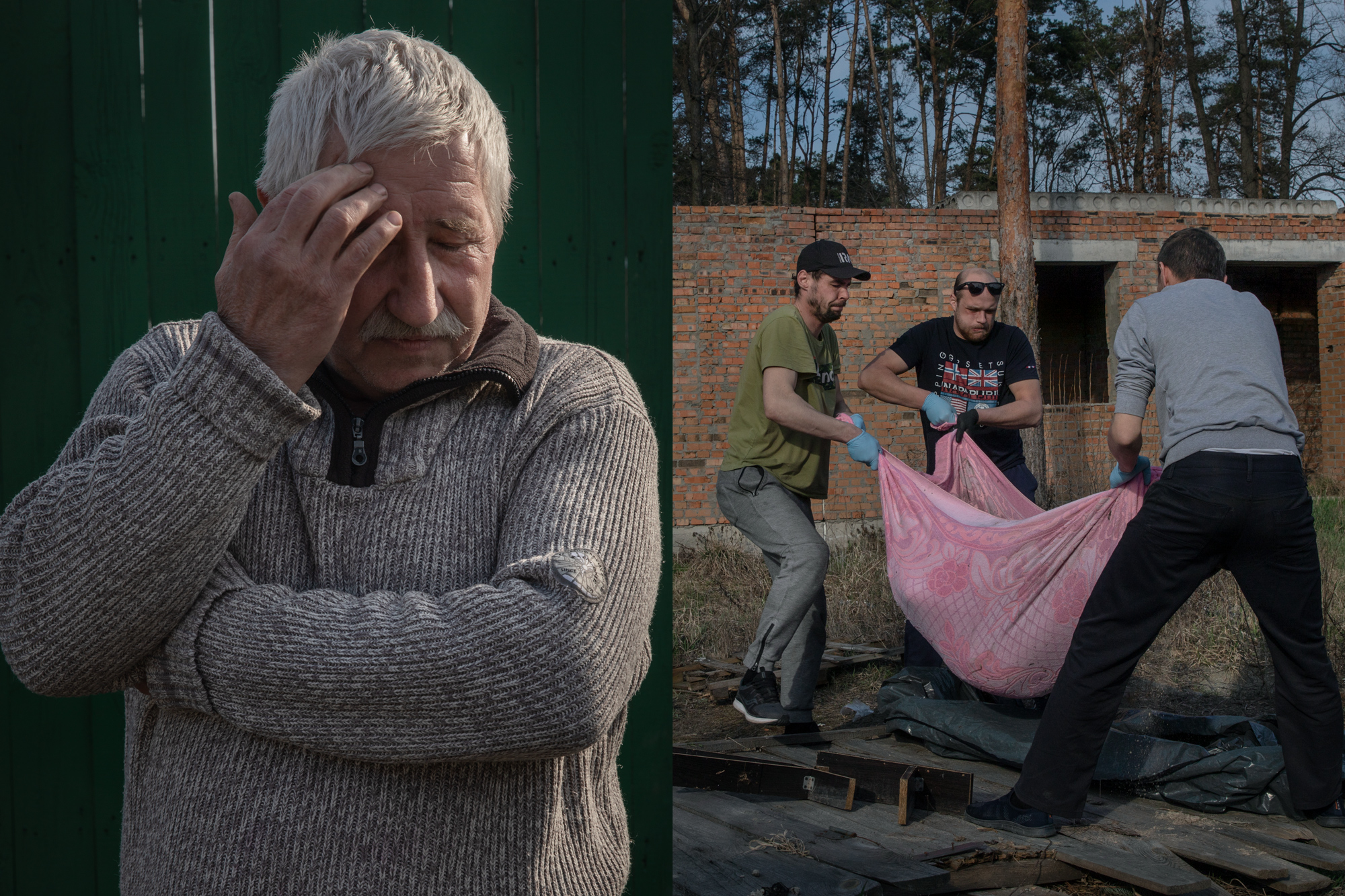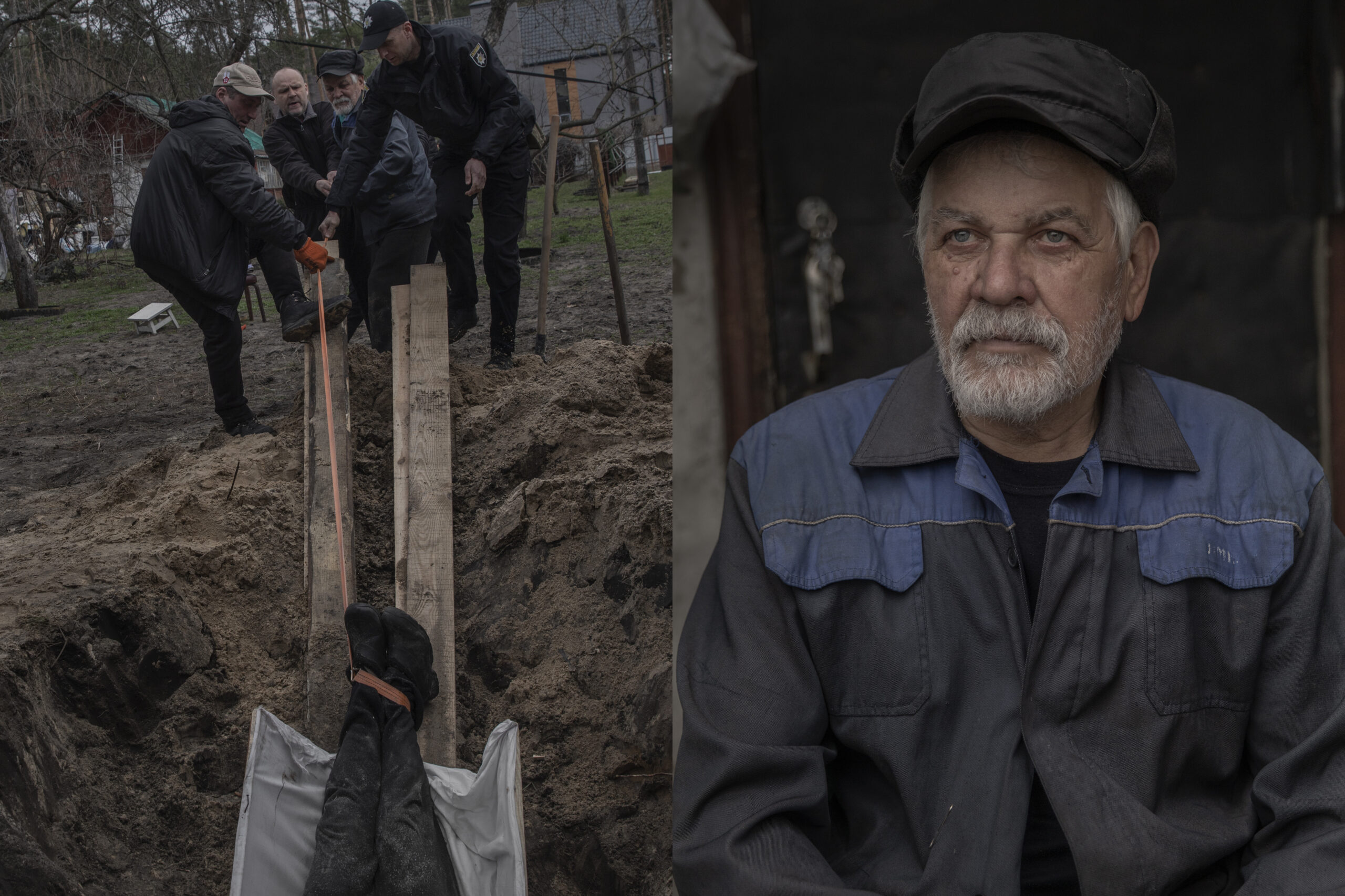 Es 8 de abril. En el gran patio trasero de una casa en el noreste de la ciudad, siete hombres cavan en presencia de dos policías. Uno de ellos da instrucciones a los demás. Tras varios minutos sacando tierra, las palas tocan un ataúd de madera. El hombre que parece al mando lo toca con tristeza. Es Valeriy, de 68 años, y en el interior del ataúd yace su hijo Oleksey, de 39. Con la ayuda de varias cuerdas, los hombres intentan sacar la caja, pero pesa demasiado. Finalmente, el propio Valeriy fuerza con una palanca de hierro la tapa hasta romperla y sacar el cuerpo de su hijo; el ataúd, vacío, se queda dentro de la sepultura. Valeriy llora. En una carretilla transportan el cuerpo hasta la entrada del patio, donde espera la furgoneta del cementerio. Todo el proceso está inundado de dolor. El cuerpo de Oleksey, que había sido enterrado provisionalmente en el patio de su casa, será trasladado ahora a una morgue para que se le haga la autopsia.