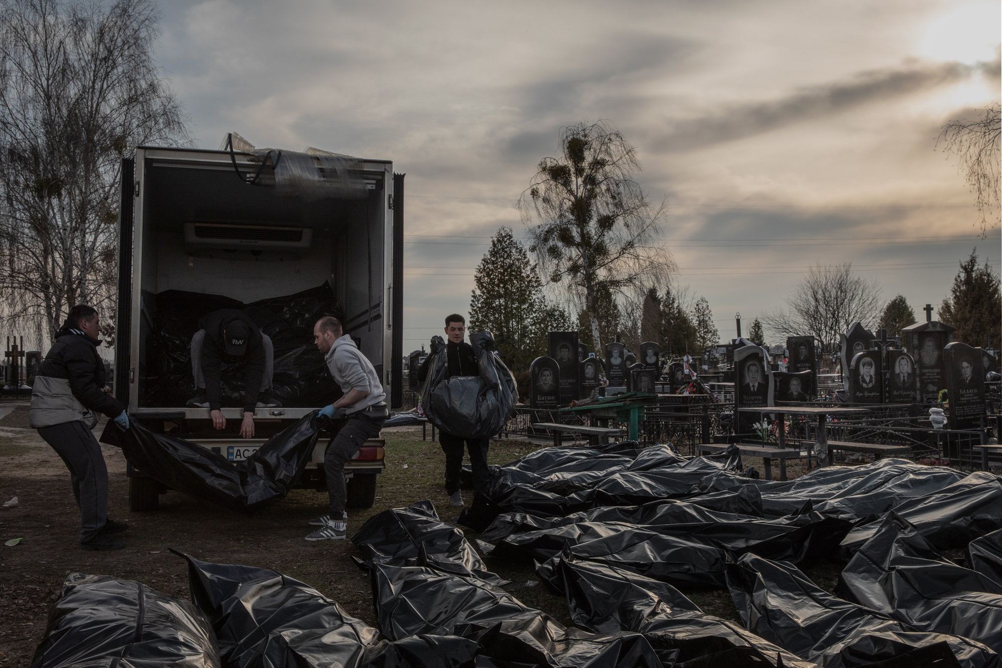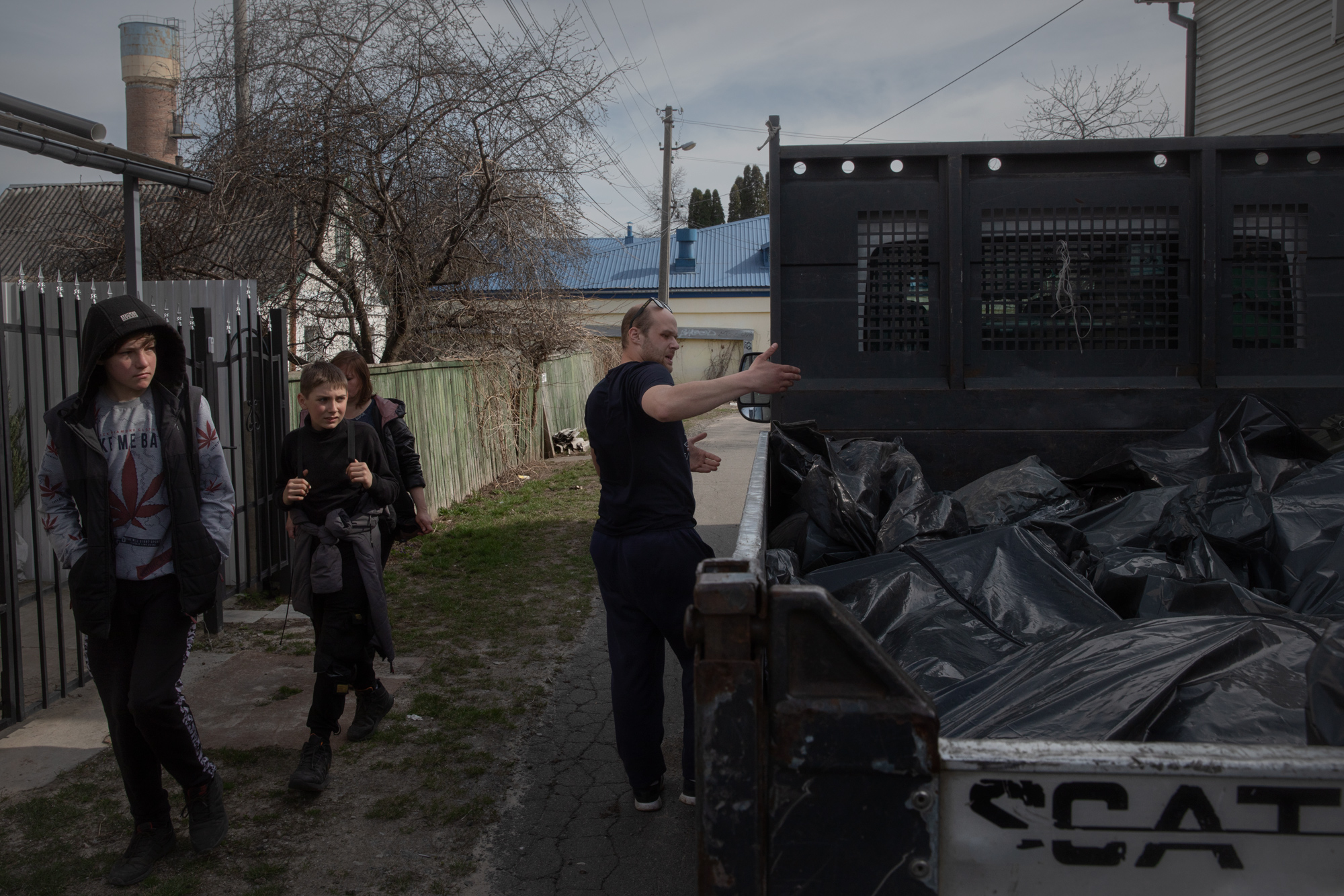 Vitaliy Chayna, de 27 años, es una de las personas que recogen cadáveres en las furgonetas blancas del cementerio. Dice que en los últimos días se han retirado unos 30 cuerpos diarios. La mayoría son de hombres, aunque también hay mujeres (él estima que cerca del 20 %) y algunos niños. Los cadáveres, envueltos en bolsas de plástico, permanecen en este cementerio un máximo de dos días, y luego son trasladados a una morgue en la ciudad de Kiev o a Bila Tserkva, al sur de la capital, para ser examinados.