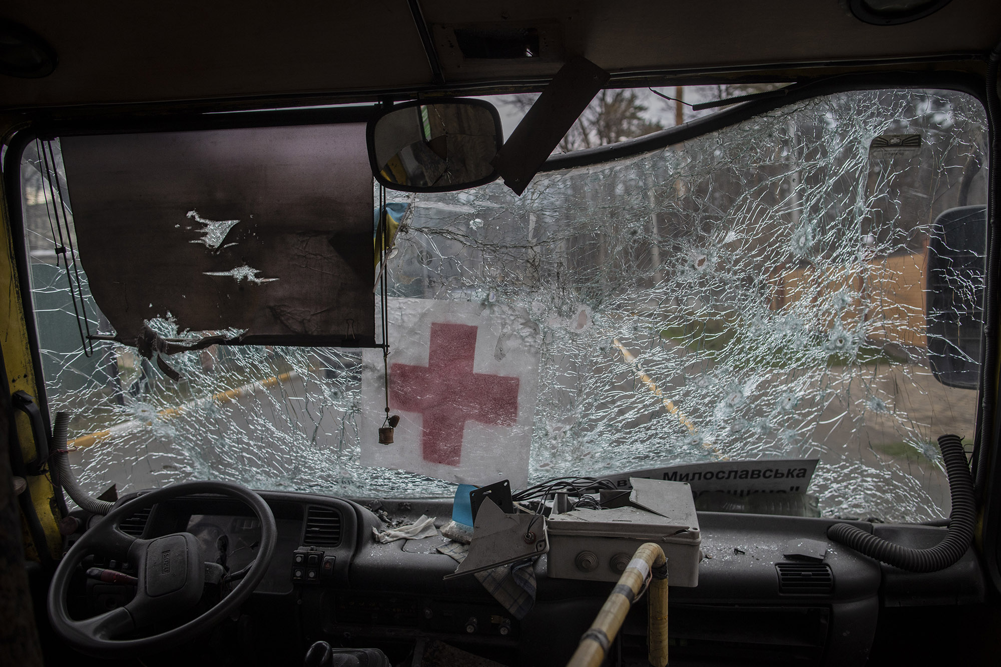 El padre Andriy pasó la ocupación entre su casa y la iglesia, que fue atacada varias veces: nos enseña cómo casi todas las ventanas están dañadas y la fachada tiene orificios de disparos. A la violencia se sumaba la falta de gas, de electricidad y de agua: algunas personas, cuenta, llegaron a beber agua extraída del interior de los radiadores.