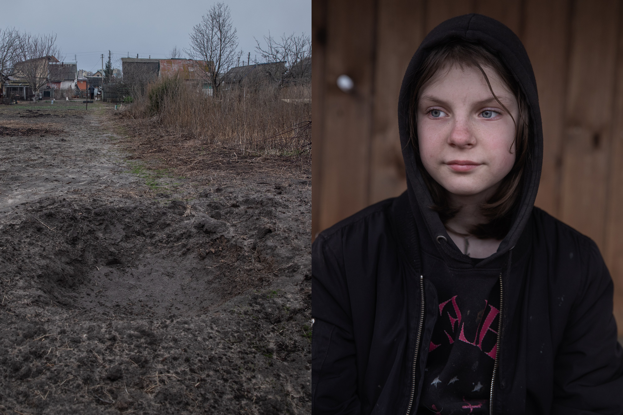 Volvemos a la calle Yablunska: allí vive Ruslana, de 10 años, con sus padres, su hermano mayor y su abuela. No pudieron huir porque no tenían coche y pasaron casi toda la ocupación en el sótano. Olga, su madre, cuenta que solo a las mujeres se les permitía salir a por agua y alimentos. Los soldados disparaban a aquellos que salían tras el toque de queda, que normalmente era de 5 de la tarde a 8 de la mañana, dice. Estaban incomunicados, sin cobertura móvil hasta el final de la ocupación.