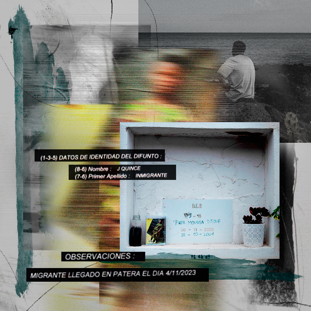 En la lápida de Papa Moussa se lee: “DEP J-15 6-11-2023”. Indira, la hija de Teseida, también voluntaria de Corazón Naranja, se acerca cuando puede al cementerio de Mocanal para escribir en mayúsculas y con rotulador negro su nombre completo, Papa Moussa Diouf, y la fecha de su nacimiento: 25-3-2001. Las inclemencias del tiempo borran las letras y los números, pero Indira los escribe y reescribe para evitar que el polvo y la indiferencia oficial arrebaten a Papa Moussa su verdadera identidad.
