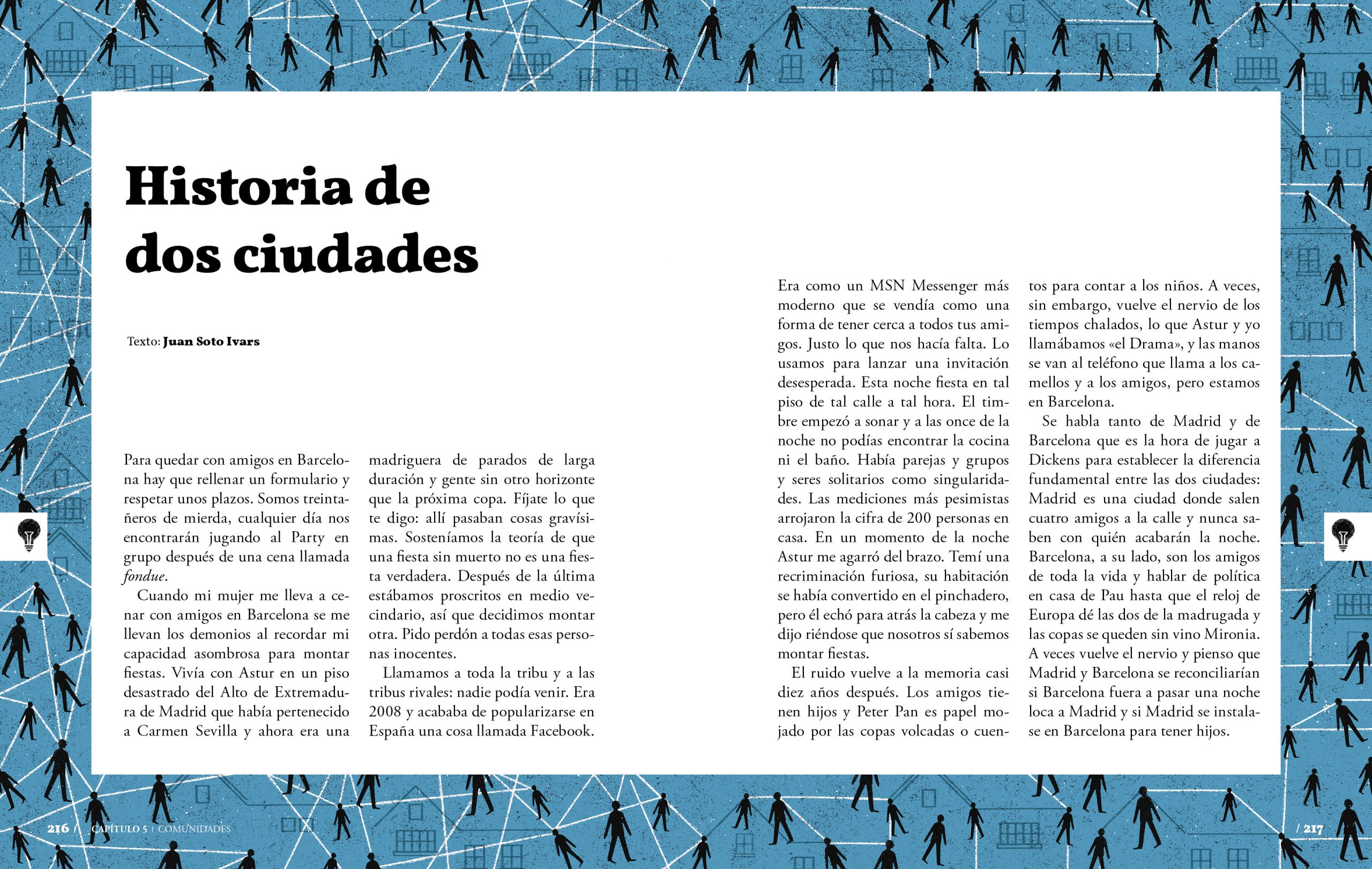 Del WHAT (apunte literario) se encarga Juan Soto Ivars, que expone su visión sobre la vida en Madrid y Barcelona, y hace a las ciudades una propuesta irrechazable: “A veces vuelve el nervio y pienso que Madrid y Barcelona se reconciliarían si Barcelona fuera a pasar una noche loca a Madrid y si Madrid se instalase en Barcelona para tener hijos”. Soto Ivars no dice nada de su natal Murcia, pero eso ya lo dejaremos para otro número.