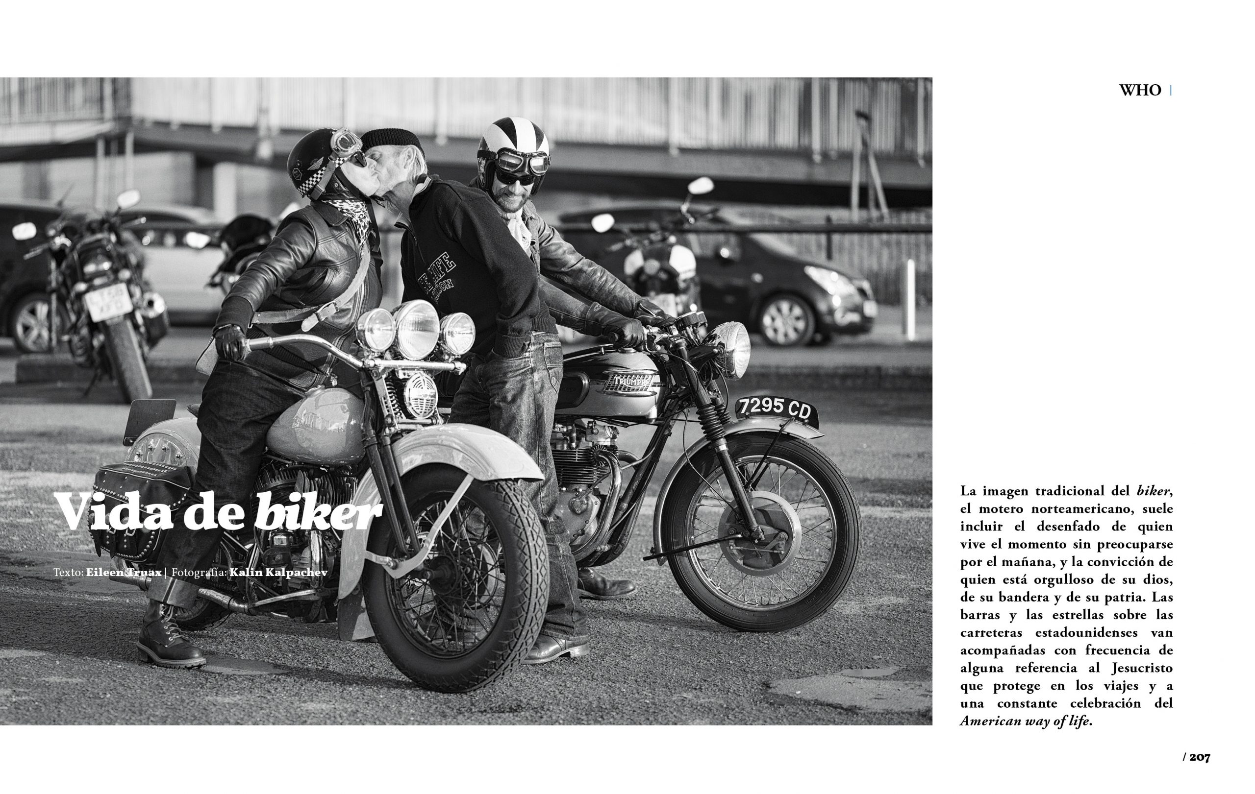 El perfil de este capítulo (WHO) tenía que ser colectivo: la cronista Eileen Truax escogió viajar con los moteros y contar por dentro su celebración del American way of life. El texto tiene pasajes evocadores: “El sonido del motor de una Harley-Davidson no es el de cualquier motor. Una Harley, como es sabido, tiene ese sonido profundo, grave. El motor enciende con un rugido y da paso a un ronroneo ronco con repentinas explosiones, como una tos. Cuando la moto arranca, la tos se vuelve rítmica y se va convirtiendo en un sonido como de helicóptero, que avanza constante”.