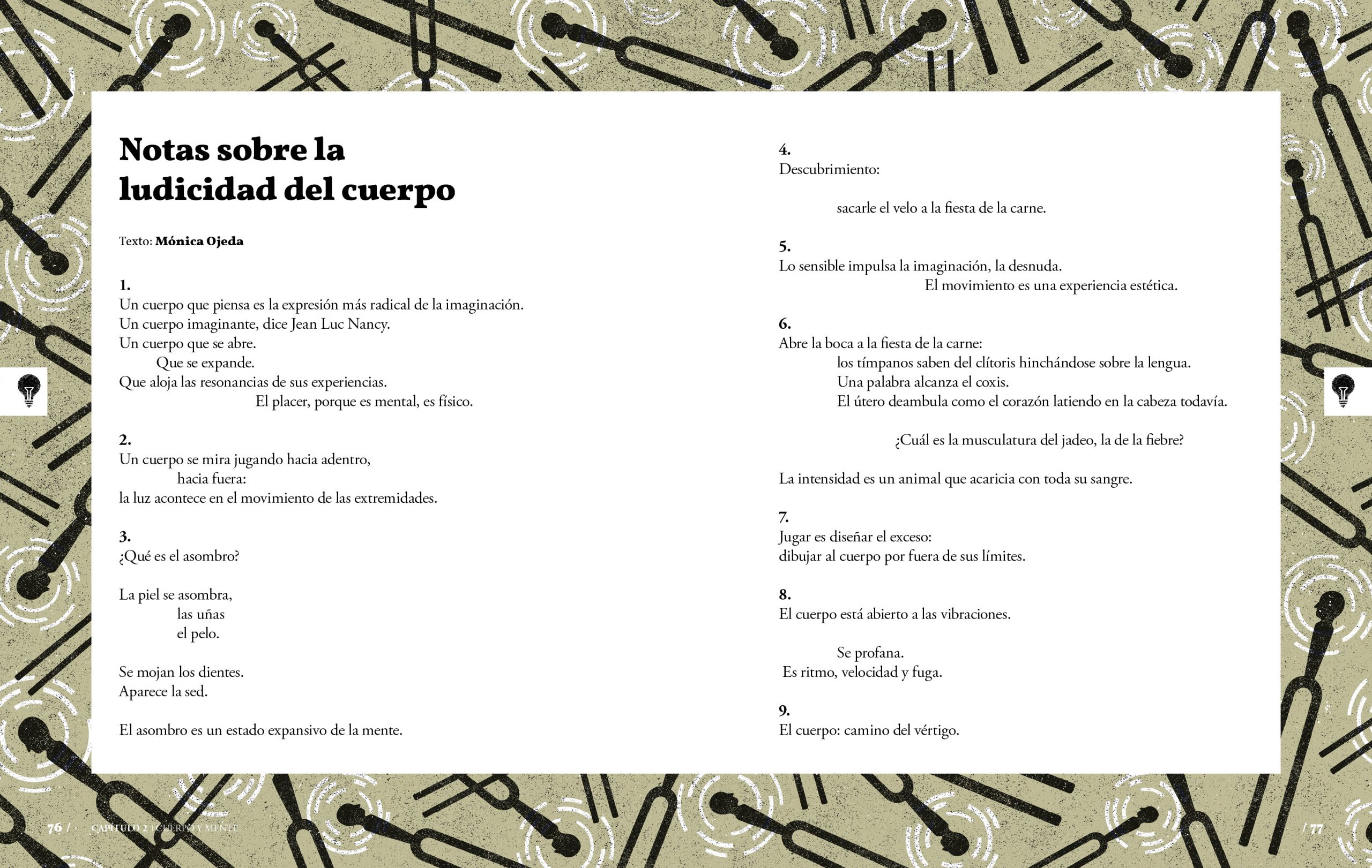 Del apunte literario (WHAT) se encarga esta vez la escritora Mónica Ojeda, autora de obras como Nefando. Y lo hace con un poema vertiginoso, Notas sobre la ludicidad del cuerpo, que nos deja versos sensoriales y pensantes como este: “La intensidad es un animal que acaricia con toda su sangre”.