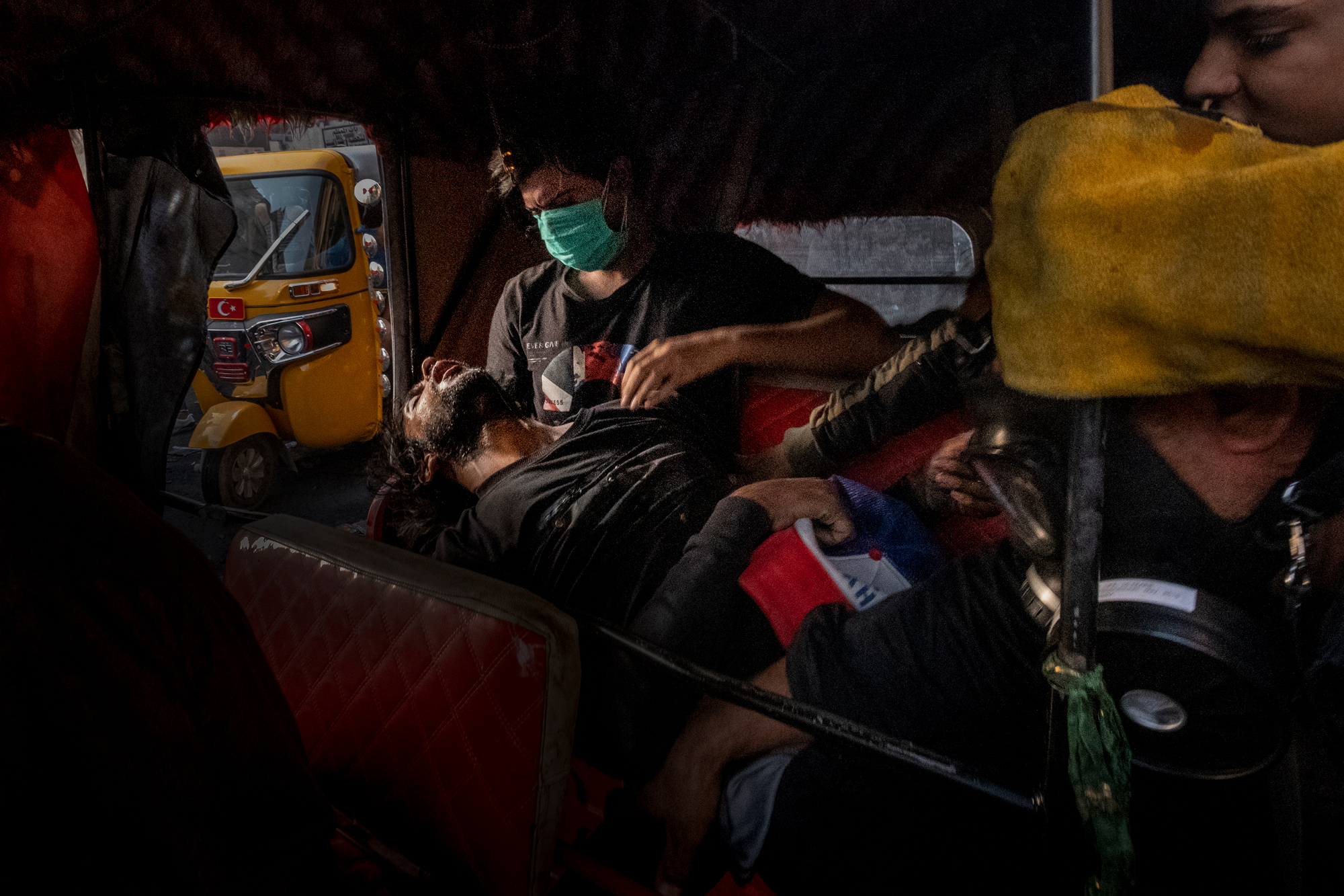 Ha perdido el conocimiento. Un triciclo motorizado (tuk-tuk), vehículo para pasajeros reconvertido en ambulancia durante las protestas de Irak, corre en su auxilio. El tuk-tuk está a punto de arrancar hacia el hospital. Son solo unos segundos, aprovechados por el fotoperiodista Ricard Garcia Vilanova, colaborador habitual de 5W, para sacar cuatro fotografías.