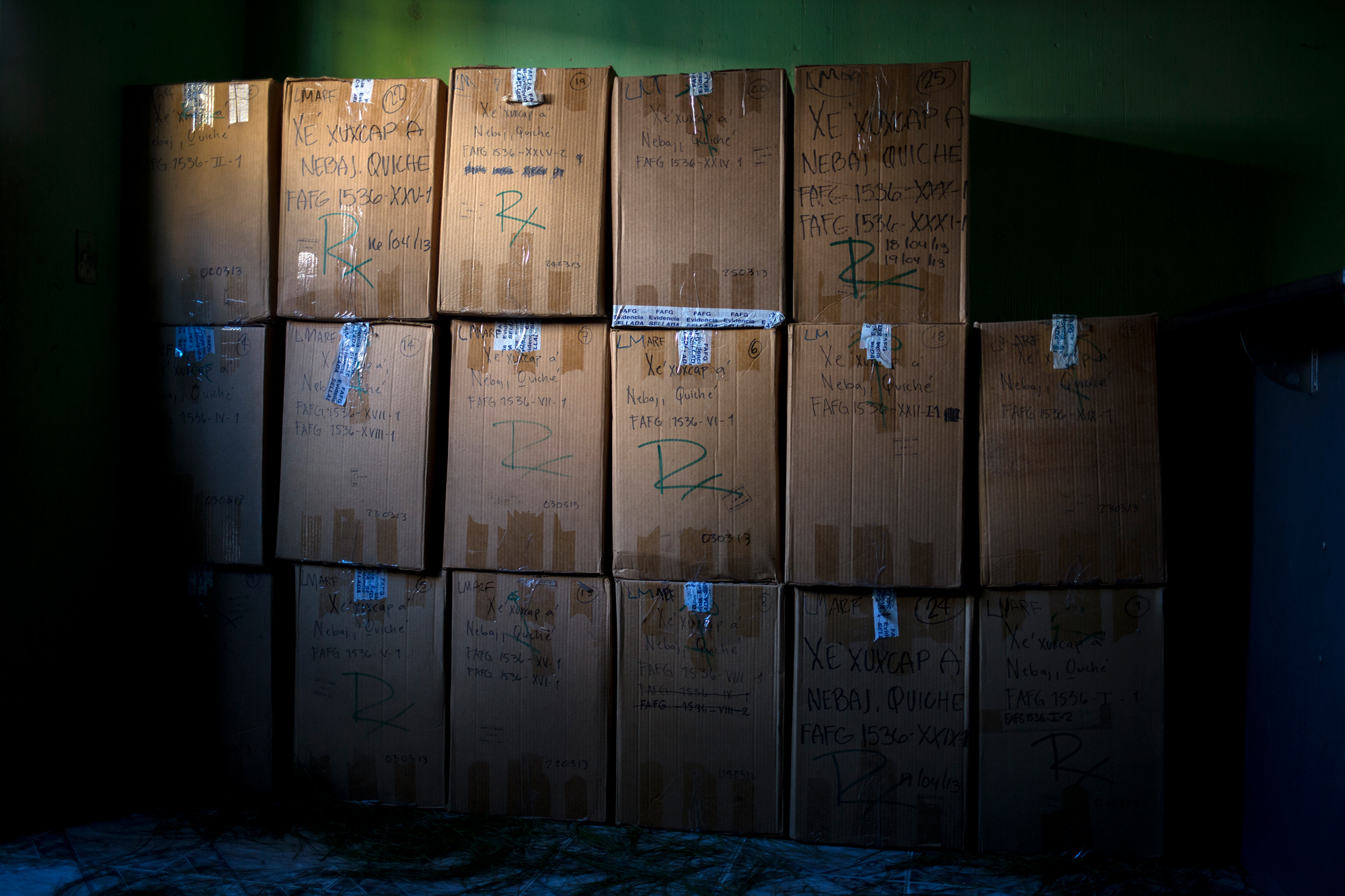 Dos hombres arrastran una mesa dentro de un oscuro salón comunal de madera, escondido entre las inmensas montañas del altiplano de Guatemala. Afuera, como casi todas las tardes, llueve. La fricción de la mesa sobre el suelo hace temblar una fila de ataúdes y una caja de cartón, colocada sobre uno de ellos, amenaza con caerse al suelo.