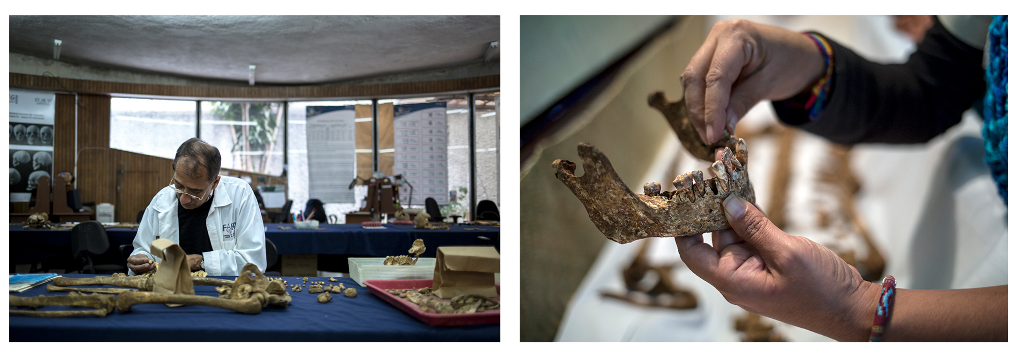 Los antropólogos forenses sacan de la caja de cartón una bolsa de papel. De esta extraen el cráneo de Teresa y lo colocan en la parte de arriba del ataúd. Las hermanas comienzan a sollozar. Sacan otra bolsa: el torso. Le siguen los huesos de los brazos, las caderas, el fémur, los dedos de los pies. Las hermanas lloran.