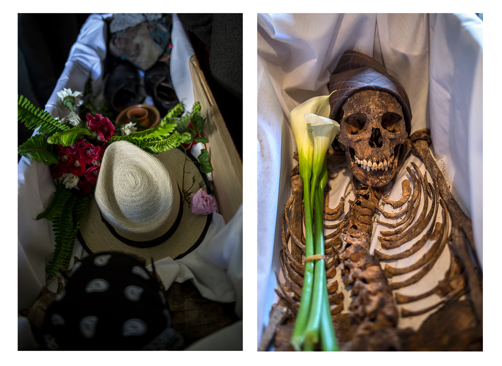 Cuando han acabado de colocar los restos, empiezan a vestir a su mamá. Primero colocan el tocoyal, la diadema de hilos y pompones característica de la región ixil. Luego sacan su huipil, con sus formas geométricas y sus colores, y se lo ponen encima del torso. La falda la colocan sobre los huesos de las piernas; la faja, encima de la cadera. Se cierra el ataúd. Varios hombres lo cargan en hombros y se abren paso hacia la salida.