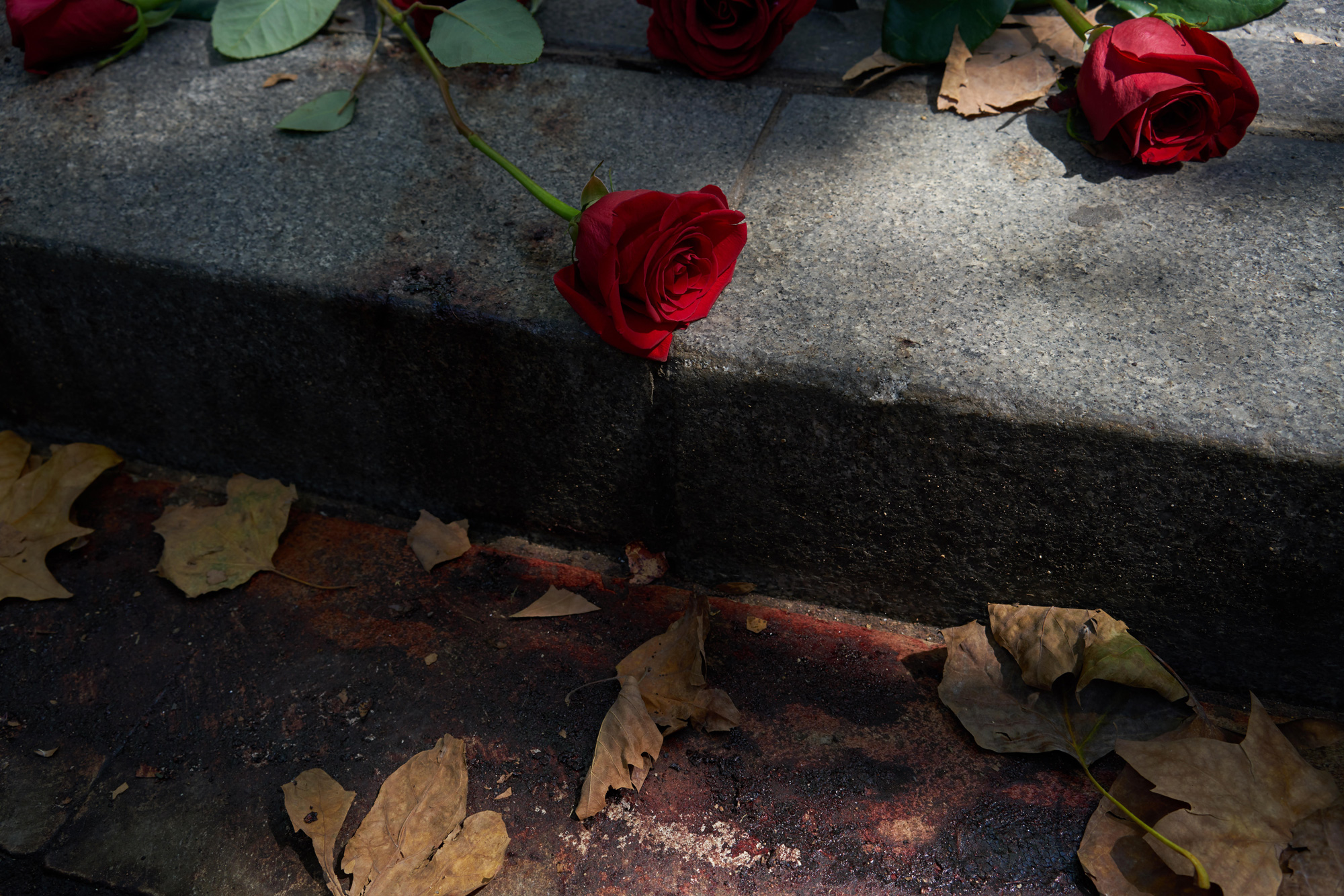 En la foto aparecen flores colocadas en uno de los lugares del ataque, donde aún se puede ver algo de sangre. Era al día siguiente del atentado. Había una multitud en Las Ramblas, casi como si no hubiera ocurrido nada la víspera. Pero el ambiente estaba apagado y la gente hablaba muy bajo.