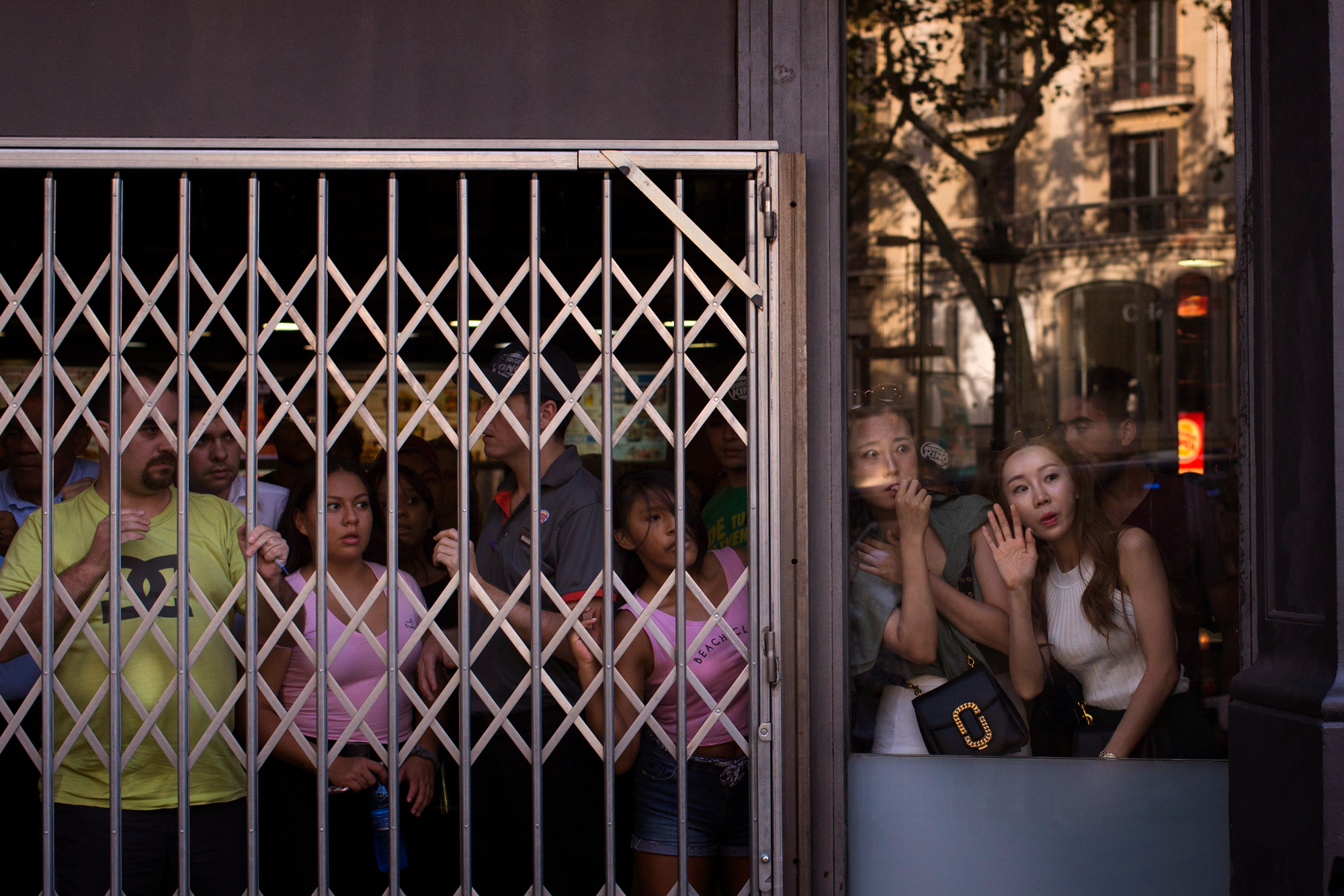 Esta imagen es de un día después del atentado. Hubo, de nuevo, un momento de tensión en Las Ramblas en el que fascistas y antifascistas se enfrentaron y la gente se encerró en los comercios, muy asustada. Fue eso lo que me llamó la atención: las expresiones de estas personas, sus caras asustadas tras las verjas cerradas de la tienda.