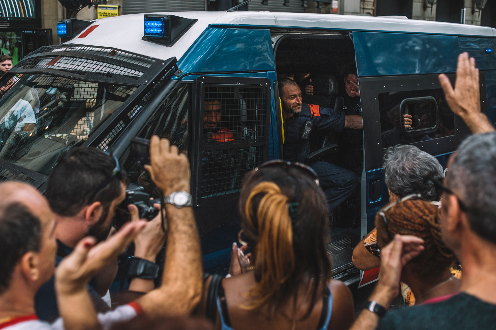 Dos días después del atentado, cuando Las Ramblas habían recuperado algo de normalidad, un grupo de taxistas inició una marcha volteando la zona con sus coches para agradecer el calor recibido de la sociedad. Al verlo, la gente que estaba paseando empezó a aclamar a los Mossos, invitándoles a hacer lo mismo. En ese momento pasaba por allí el furgón de la foto, que abrió la puerta para devolver el gesto. Estaban muy emocionados. La gente les aplaudía y les cogía de la mano.