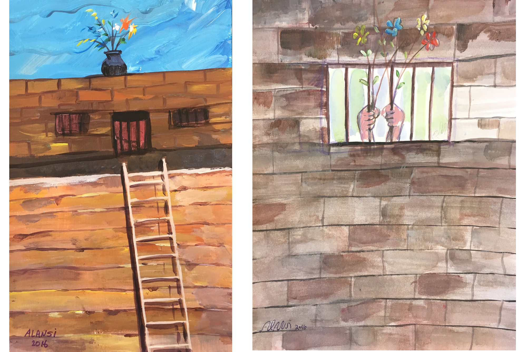 Durante sus casi quince años de cautiverio pintó más de 300 cuadros, aunque él no se atreve a denominarlos “obras de arte” y se refiere a ellos como “papeles pintados”, explica en una carta a un artista americano recogida en el catálogo de la exposición. Sin embargo, el arte es muy importante para él. Jacob recuerda: “En nuestra primera reunión nos pasamos casi todo el rato mirando sus obras y hablando sobre su arte, durante más de una hora”. Al Ansi se emocionó cuando Jacob le propuso sacar algunas pinturas para enseñárselas a una amiga artista.