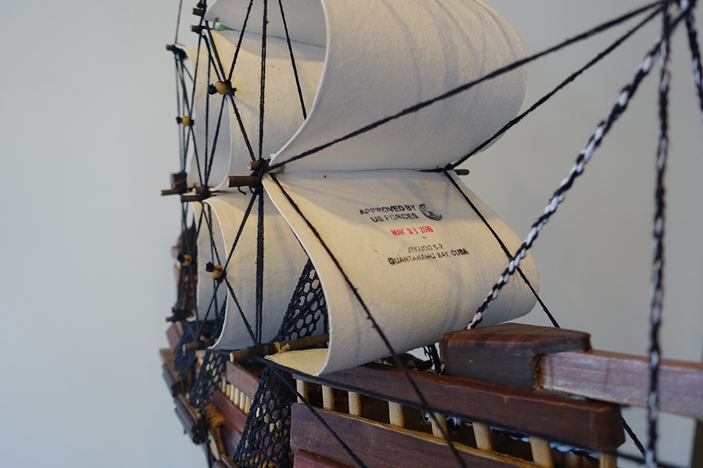 Atrapados en celdas claustrofóbicas, donde el tiempo pesa más que el calor húmedo que impregna las pesadas paredes de cemento, muchos presos encontraron en el arte una vía de escape. “Cuando empiezo una obra de arte, me olvido de mí mismo”, explica en el catálogo Moath Al Alwi, autor de la espectacular maqueta de barco de más de medio metro de largo expuesta en “Oda al mar”. Al Alwi es originario de Yemen y lleva en Guantánamo desde 2002. Fue detenido en la frontera entre Afganistán y Pakistán en diciembre de 2001 junto a una treintena de hombres. Según un perfil elaborado por los servicios de inteligencia norteamericanos, Al Alwi fue supuestamente un guardaespaldas de Osama bin Laden, el líder de Al Qaeda. Pero en los dieciséis años que lleva en la prisión, nunca ha sido acusado formalmente de ningún crimen.