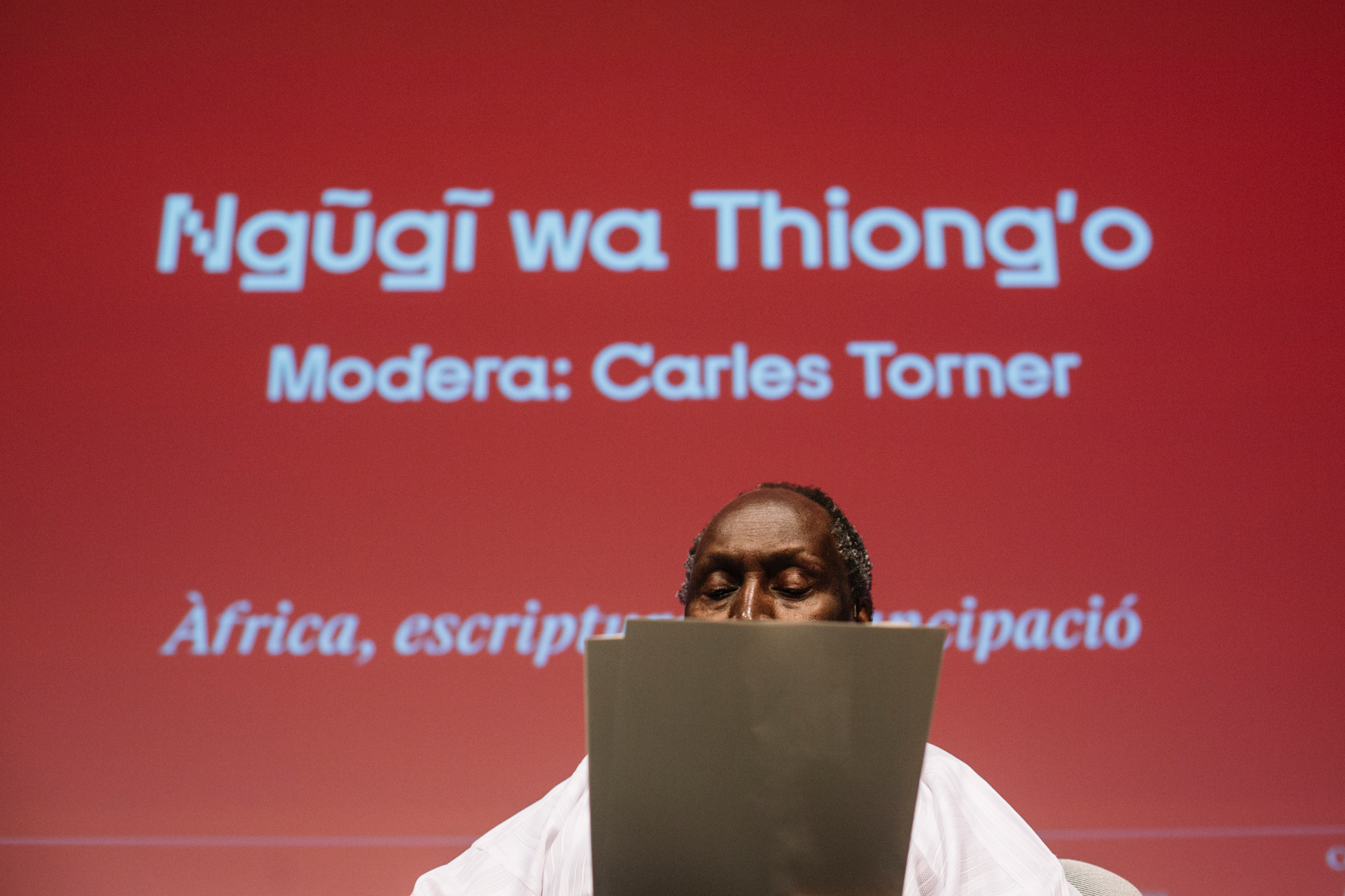 Sala 1 del Centre de Cultura Contemporània de Barcelona (CCCB). Encuentro con la prensa. Le preguntan a Ngũgĩ por sus posibilidades de ganar el Premio Nobel y por el último ganador. Ya está acostumbrado.