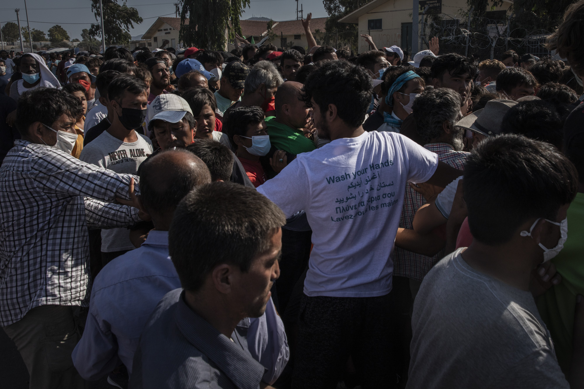 Pero la Policía tampoco se olvidó de los que estaban allí. Desalojó los olivares más cercanos a Moria, de donde huyeron despavoridos los refugiados que se pensaban allí bien escondidos, al margen del lío que se había montado en la isla, y que tras la operación policial se instalaron en aparcamientos de almacenes, en la zona semi-industrial que conecta Moria con el litoral oriental de Lesbos.