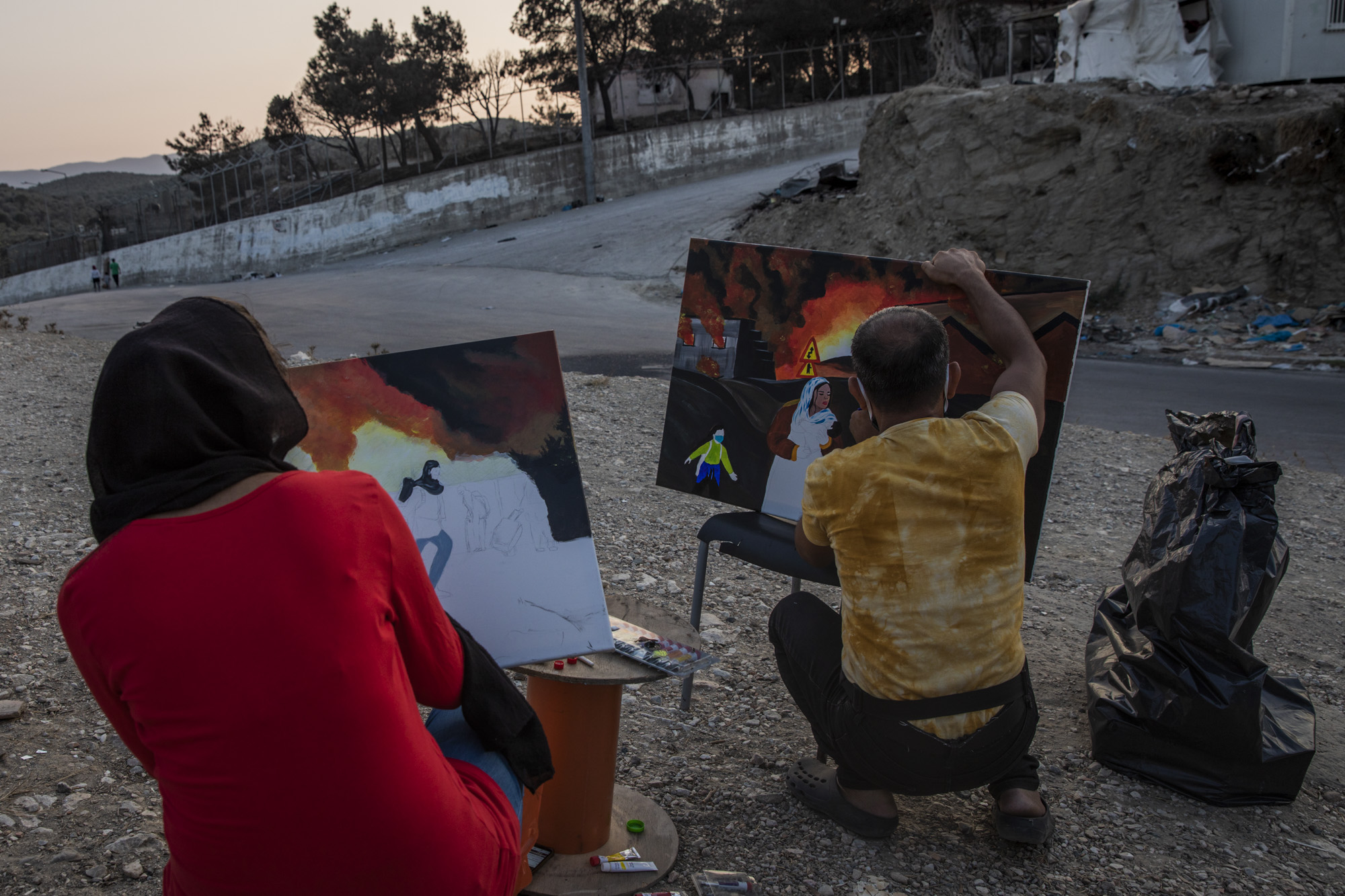 Otro día, veo a la pareja de espaldas a los olivares y de cara a una carretera, a unos centenares de metros del complejo de Team Humanity, donde durmieron durante varias noches. Shukran pinta un cuadro: otra vez el mismo cuadro, pero no es el mismo cuadro, es más pequeño, tiene algunos cambios, me advierte. Lida se inspira en otra fotografía para pintar otro cuadro: el móvil sobre la base del taburete con la foto, una botella de agua cortada para limpiar los pinceles, el sol cayendo, los coches que aminoran la marcha para ver qué pintan, los periodistas que les hacen fotos —un fotógrafo se acerca durante un minuto, sin saludarlos, dispara y se marcha—: ya son una celebridad en la isla. Brocha gruesa ella porque ha empezado el cuadro, pincel fino él porque está acabando el suyo, perfilando los detalles.