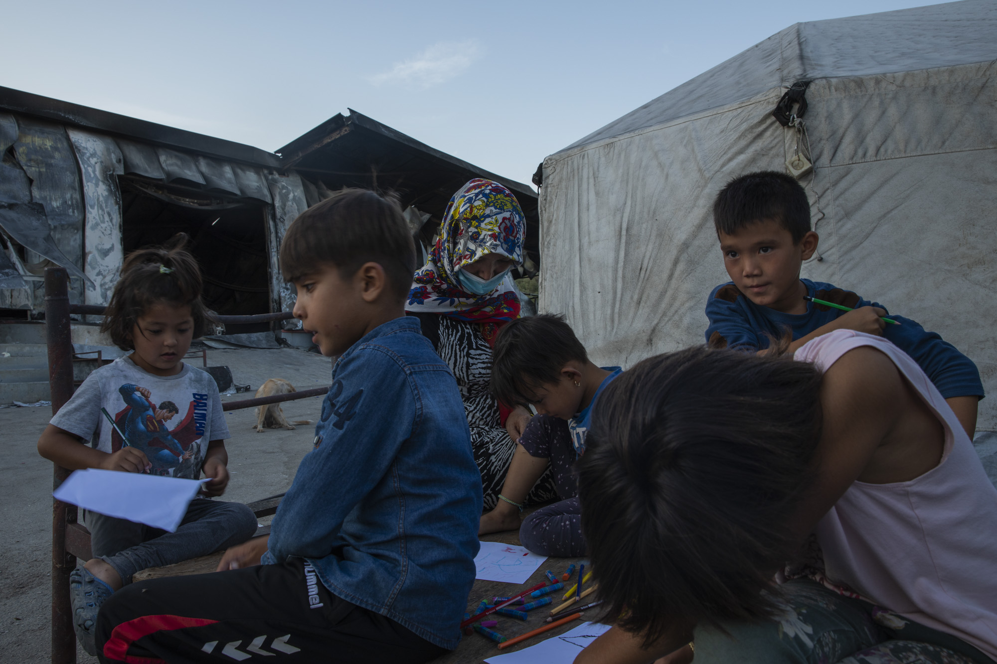 La mañana que se van al nuevo campo, habíamos quedado para ir a Moria y hacerles unas fotografías en la escuela, reducida a cenizas. Los días anteriores lo habíamos intentado también, pero la Policía nos lo había impedido —actuaba con el mismo capricho en todos los lugares de la isla, con la misma arbitrariedad, abriendo y cerrando lugares a su antojo. Esta mañana tampoco podemos ir, porque se van. Se van al nuevo campo con la promesa de que seguirán pintando y educando a sus estudiantes, allá donde vayan.