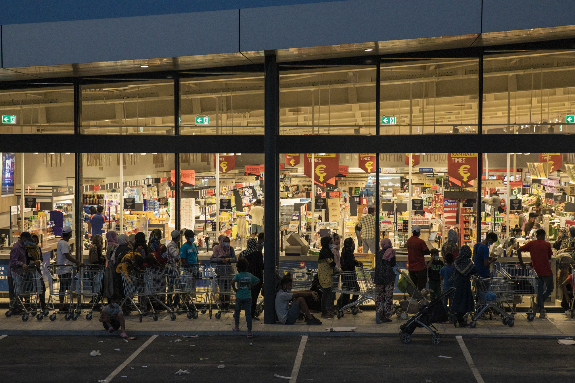 Los extremos del corredor fueron bloqueados por las fuerzas de seguridad. Se dejaba entrar a la prensa de forma intermitente. En nuestra primera visita, el 11 de septiembre, la presencia de ayuda humanitaria y de oenegés era casi inexistente. No había reparto de comida —eso llegaría después. Las imágenes de tiendas construidas con cañas, gente alojada en el aparcamiento de un supermercado Lidl o frente a gasolineras valladas se tomaron y se difundieron, a menudo con el consiguiente subtexto: esto está pasando en la Europa del siglo XXI. El problema es que ya se han visto en Europa tantas humillaciones de personas refugiadas —naufragios, bloqueos fronterizos, abandono en el mar, devoluciones en caliente, gases lacrimógenos—, sobre todo desde 2015, que la indignación se ha apagado. Los días después del incendio de Moria son la consagración de este proceso. La normalización del sufrimiento refugiado. Antes se decía: es indignante que esto pase en Europa en pleno siglo XXI. Ahora se puede decir: es indignante, pero estas son las cosas que pasan en Europa en el siglo XXI.