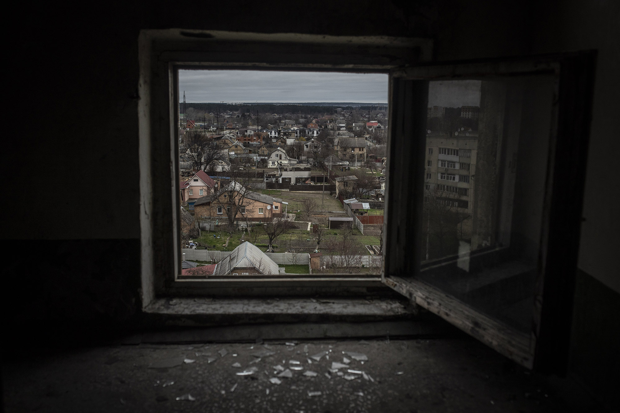 En la imagen vemos la ciudad de Bucha desde un edificio de nueve plantas en la calle Yablunska, que fue en la que se hallaron más cadáveres. Es uno de los tantos edificios que ocuparon los soldados rusos y desde cuyas ventanas controlaban a la población civil.