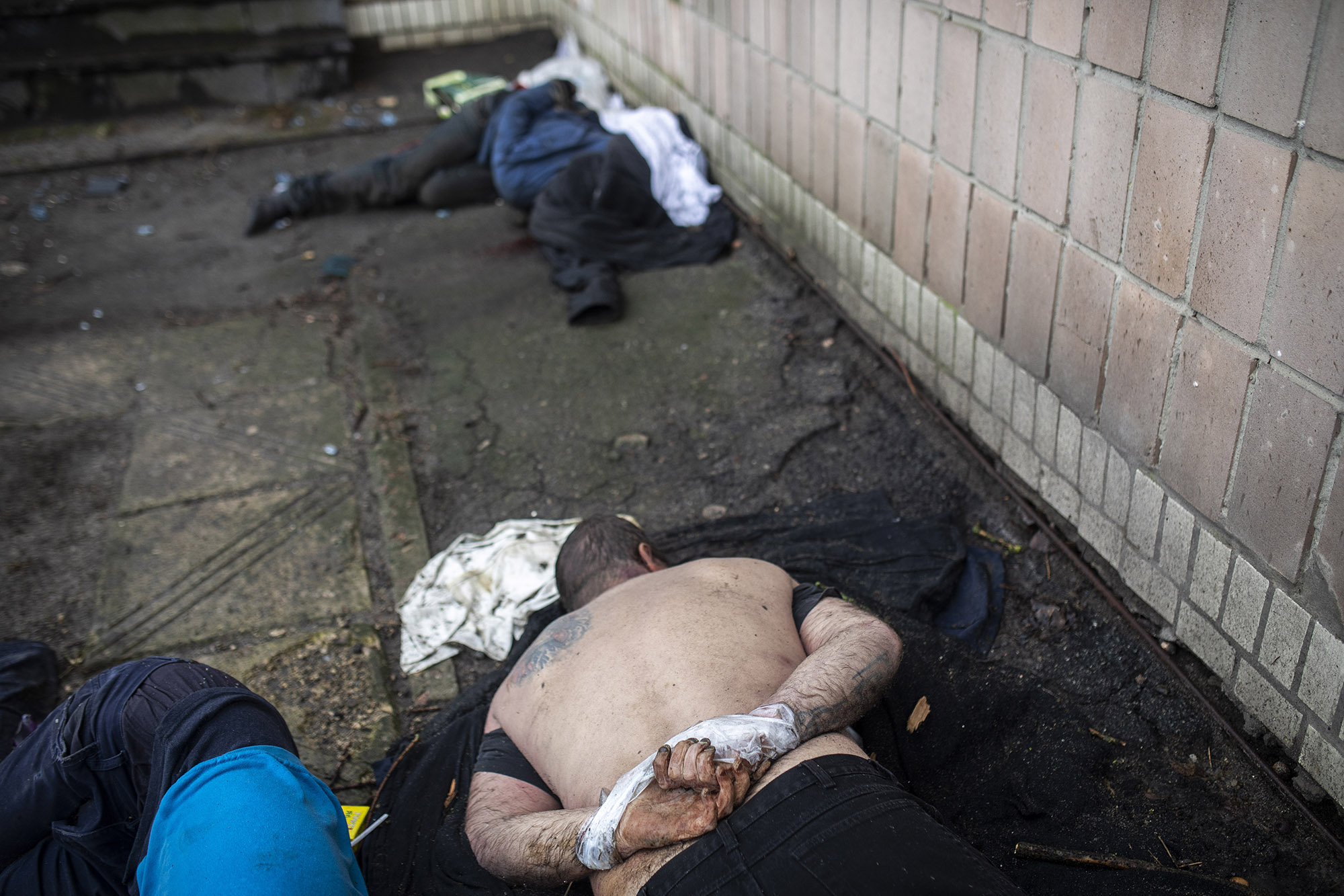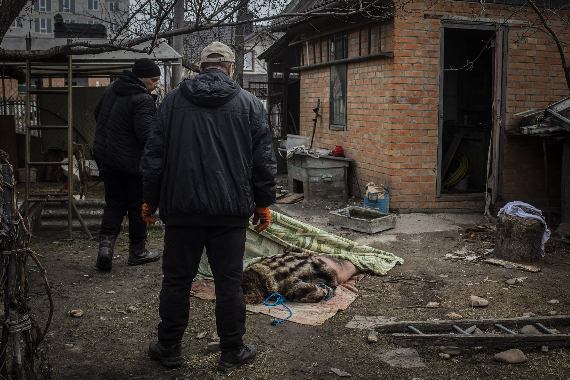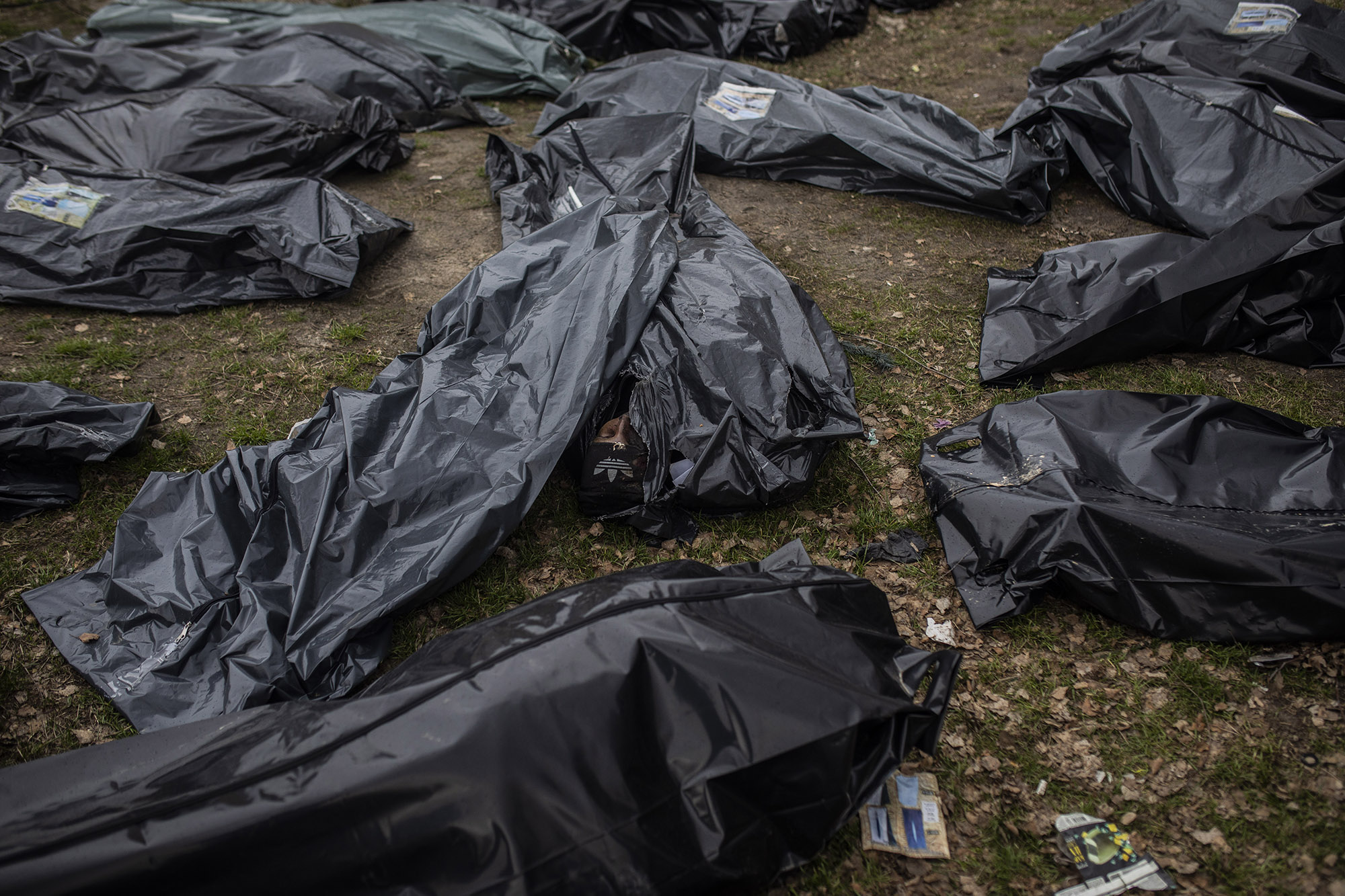 Entre los cuerpos hallados estaban los de dos hombres tirados frente a las vías ferroviarias que atraviesan Bucha. En esta imagen del 6 de abril se ve cómo uno de ellos tenía una cuerda atada alrededor de los pies. Impresiona que los cuerpos hayan pasado tanto tiempo allí. Hay muchos fallecidos aún sin identificar por familiares. Como la mayoría de la población aún no ha regresado a Bucha, muchos están siendo identificados por conocidos o amigos de amigos.