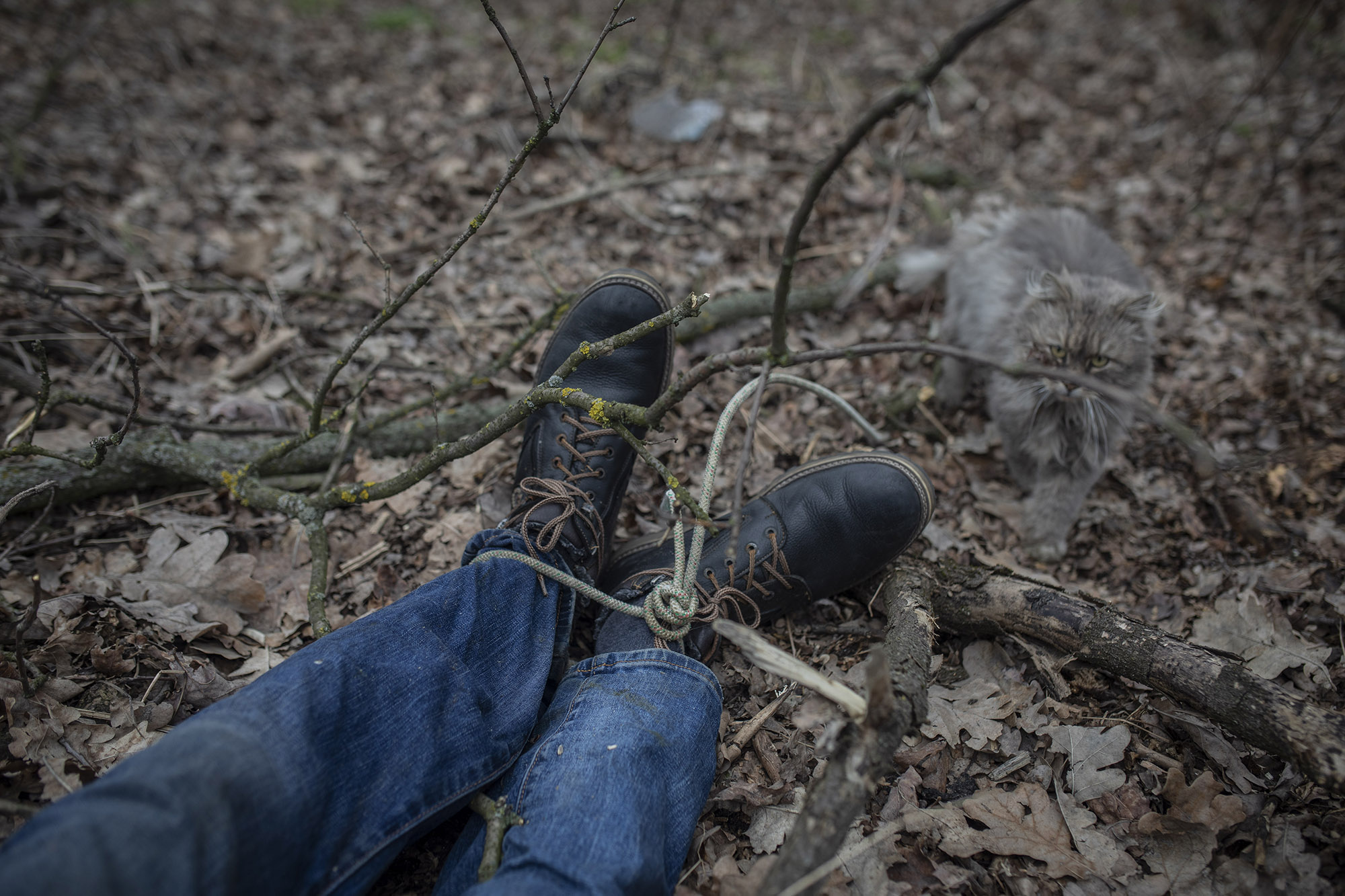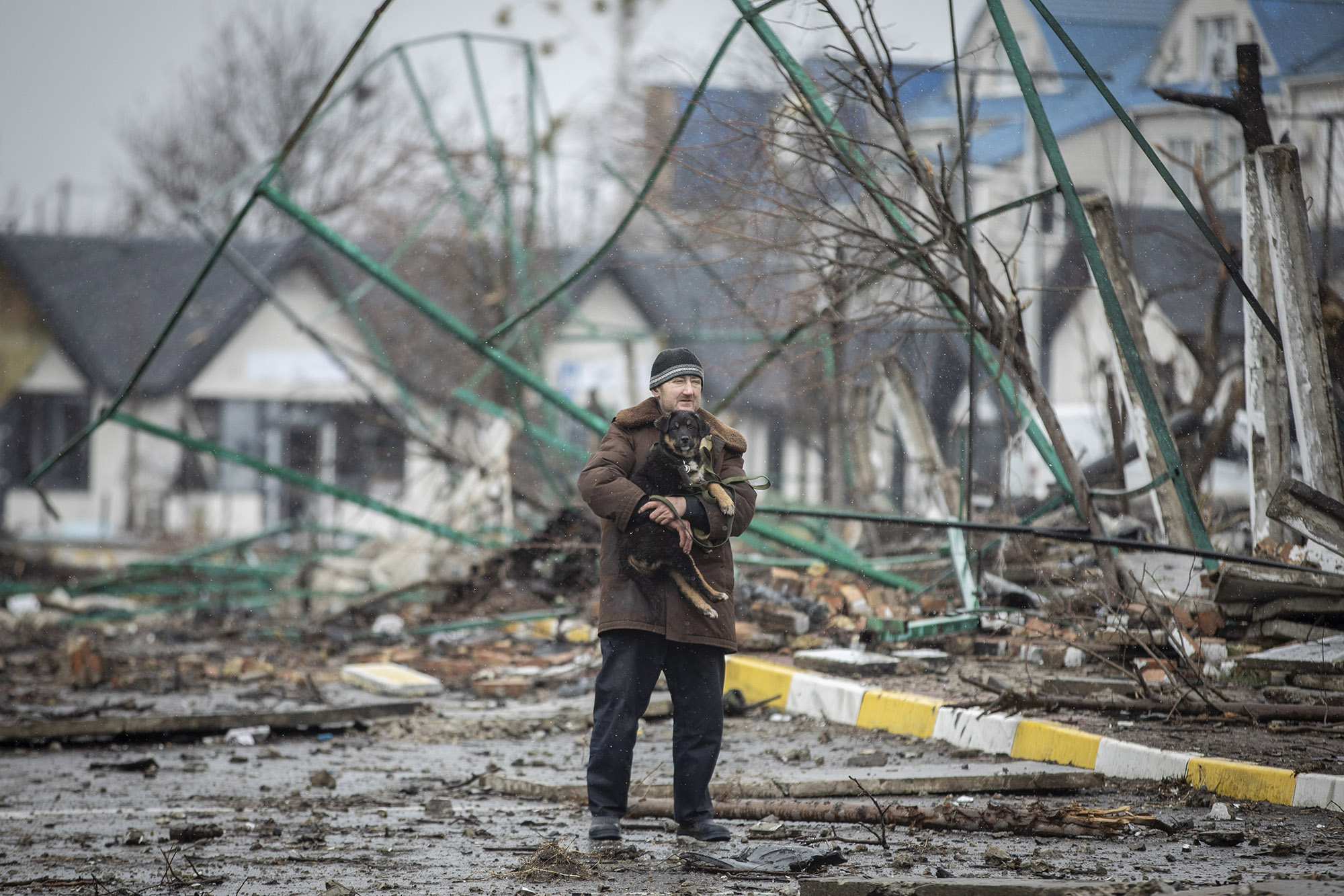 Esta imagen está tomada el domingo 3 de abril por la mañana, con las calles de Bucha prácticamente vacías. Parte de los vecinos todavía no se atrevía a salir. Estaba nevando cuando apareció Vasil junto a un amigo y sus cinco perros.
