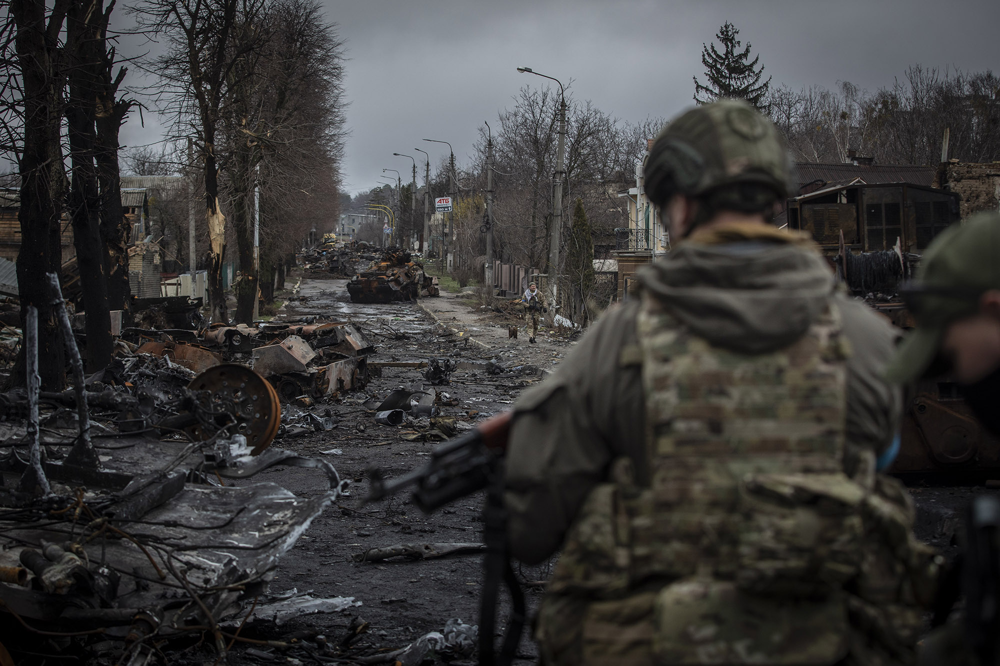 Una columna de tanques fue atacada en una ofensiva de las tropas ucranianas en la calle Vokzalna. El sábado 2 de abril, militares ucranianos caminaban entre los restos de los tanques rusos, fotografiando e inspeccionando todo. Muchas de las casas que hay alrededor de los tanques estaban destrozadas.