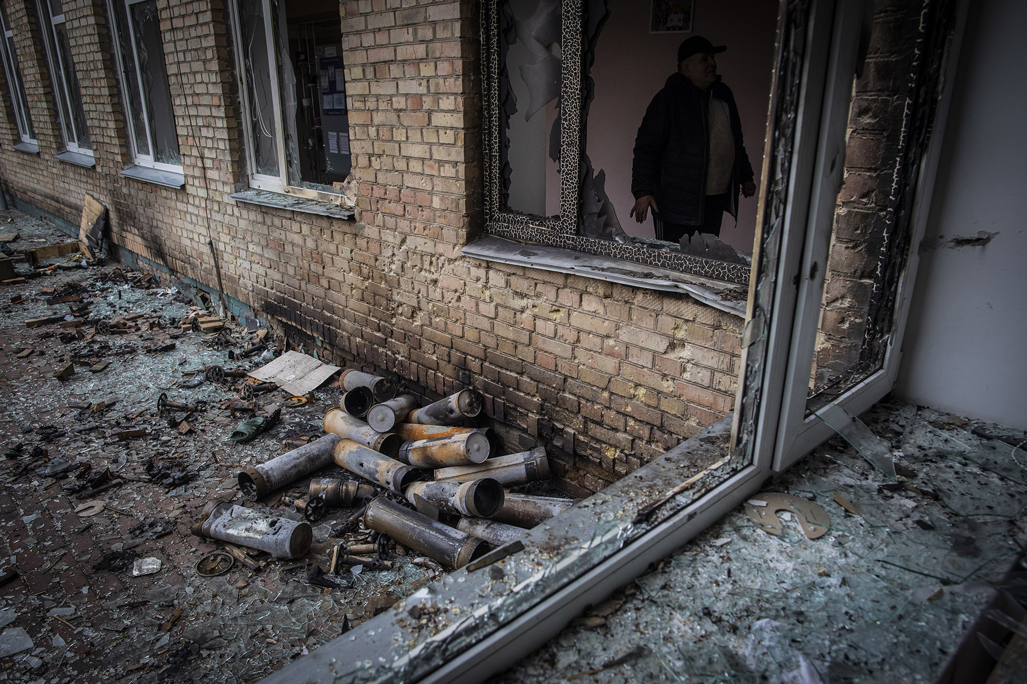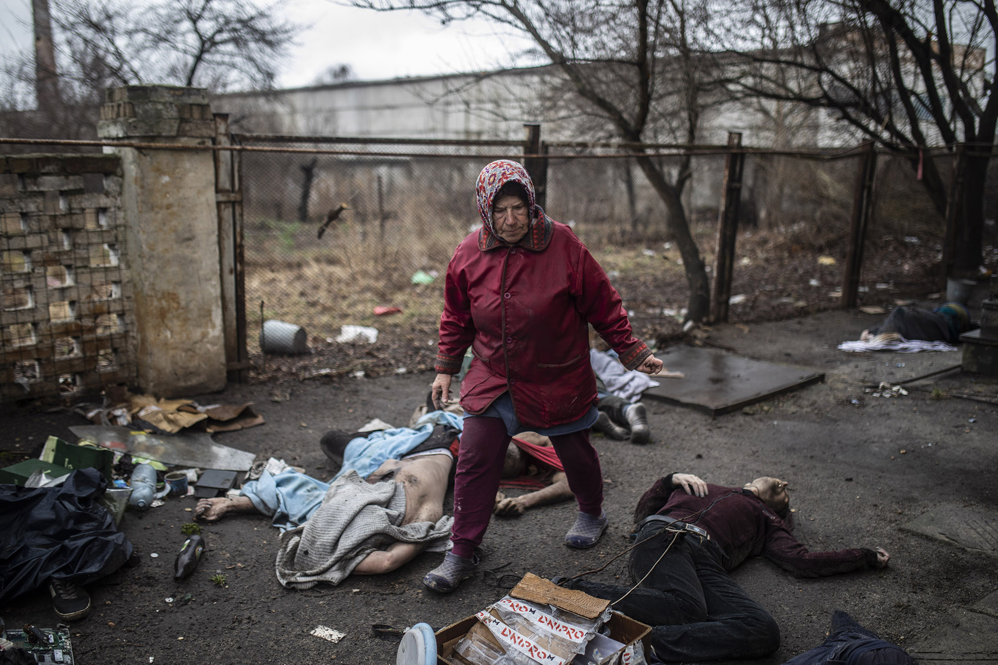 En esta imagen vemos a Olga, de 80 años, caminando entre cuerpos sin vida junto al que sirvió como cuartel general de las tropas rusas. Olga vivió la ocupación junto a su marido Mykokla, de 85, encerrada en su casa la mayor parte del tiempo.