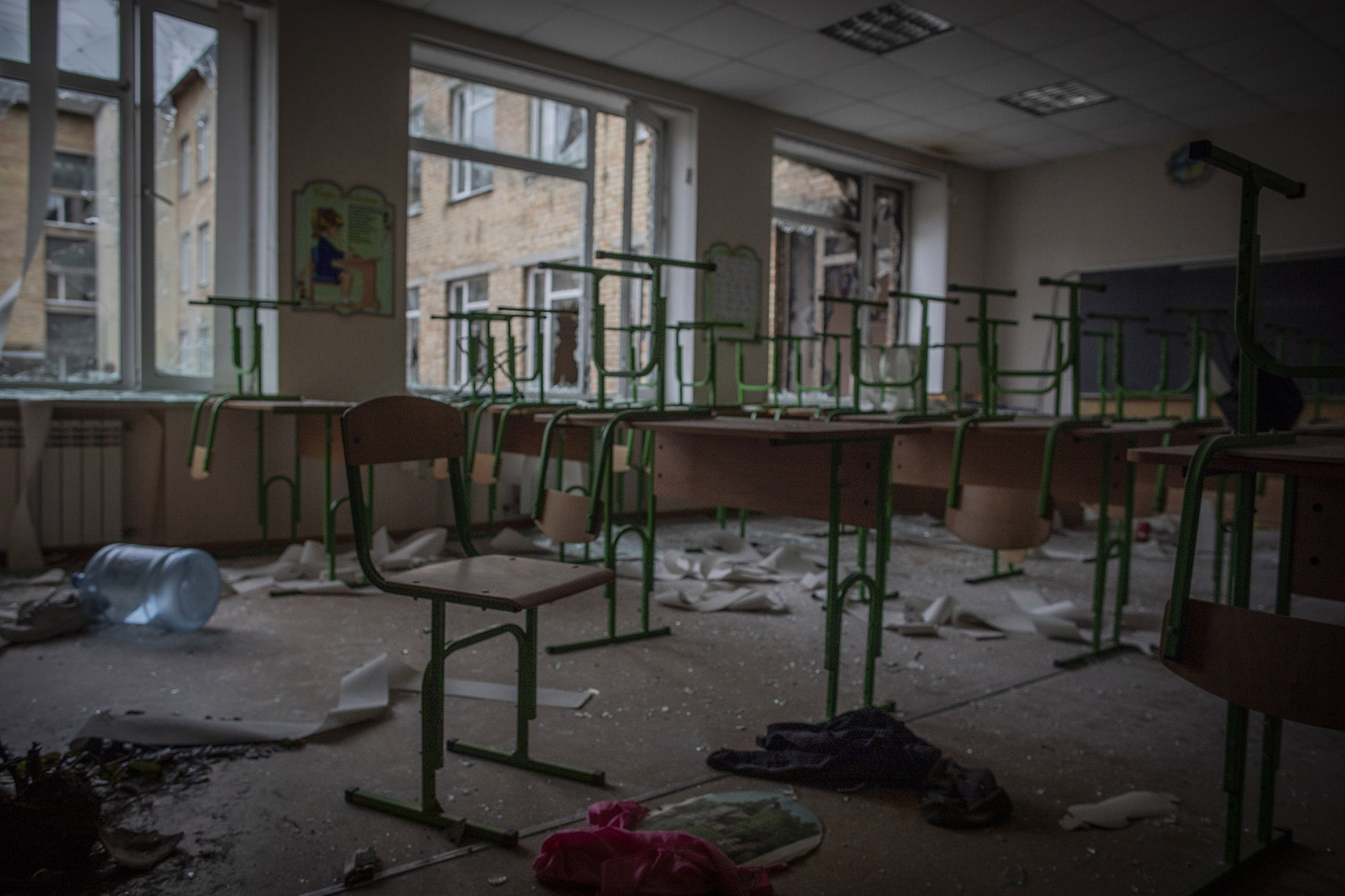 Hay muchísimas ventanas rotas, restos de la munición, algunas zonas quemadas. Desaparecieron todos los discos duros del aula informática, las herramientas del taller, hay televisiones en las aulas con disparos…