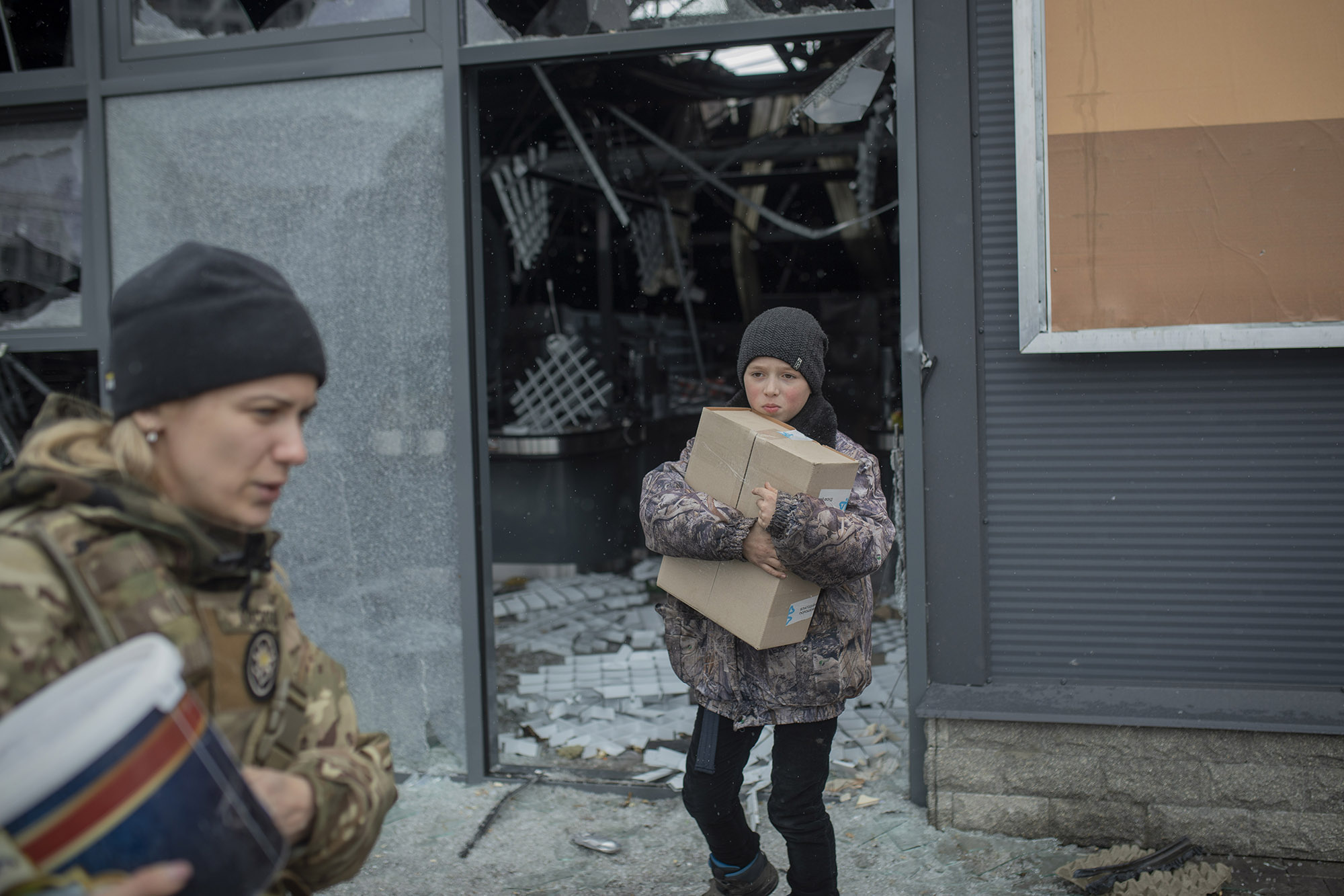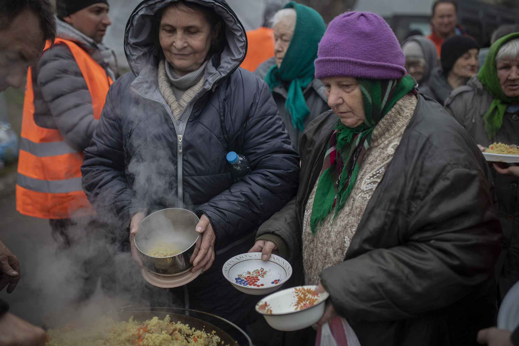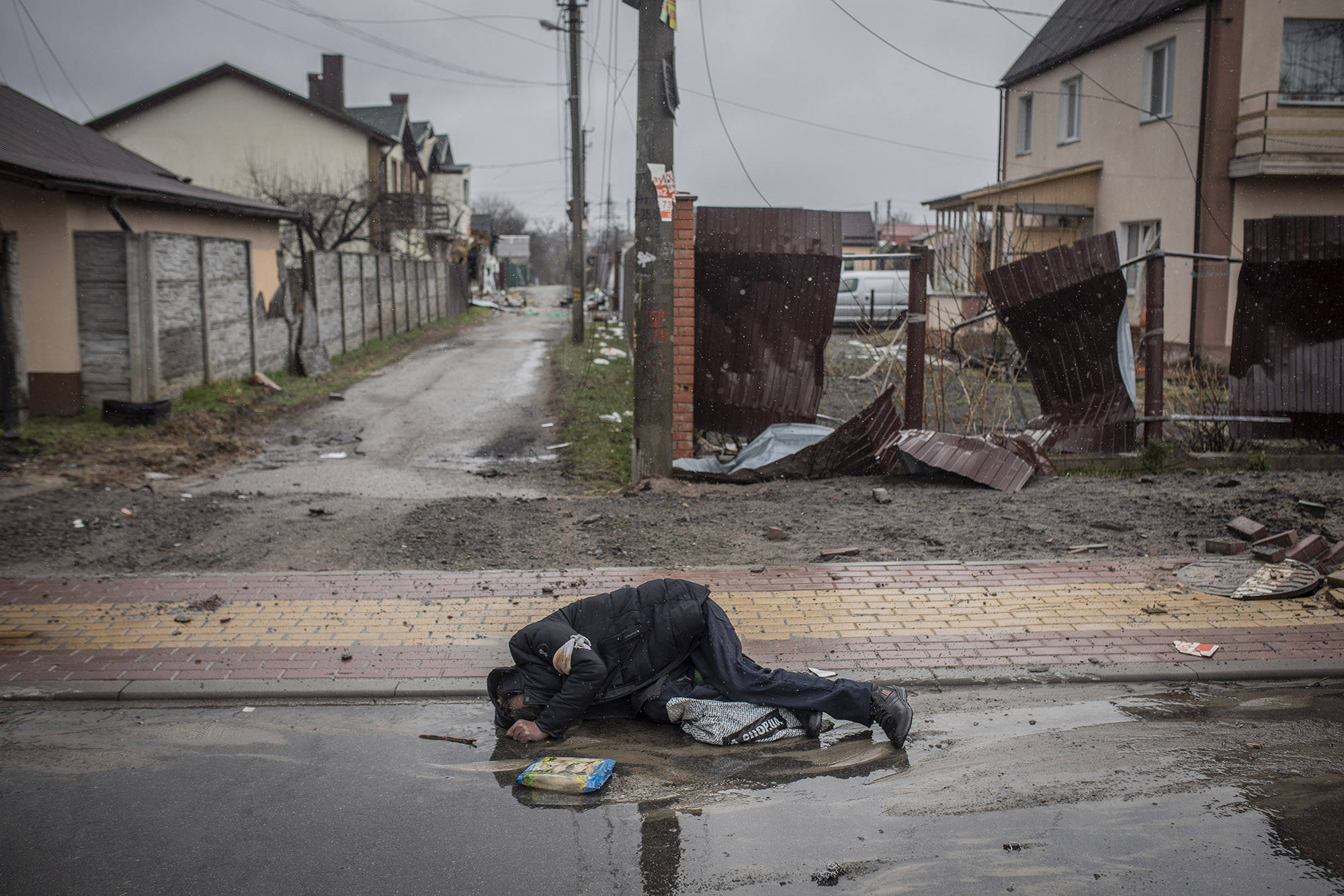 El domingo 3 de abril el Ejército y voluntarios de las denominadas fuerzas territoriales de defensa —organizadas por militares en la reserva— llevaron a cabo una distribución de comida. Fue el momento en que empezó a haber más población civil en las calles, sobre todo personas mayores, pero también algunos niños. Este lugar estaba al lado de una tienda totalmente destrozada en la calle Vokzalna.