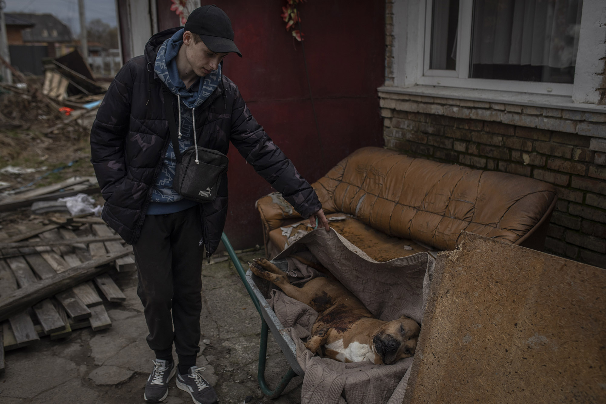 Tres días más tarde, el 6 de abril, encontramos a Nazar, de 17 años, hijo del hombre fallecido que aparece en la foto anterior. Nos dijo que soldados rusos mataron a su padre, Roman, de 43 años, junto a su tío y a un tercer hombre, todos en ese mismo jardín. Nazar nos mostró además el cadáver de su perro, al que también mataron.