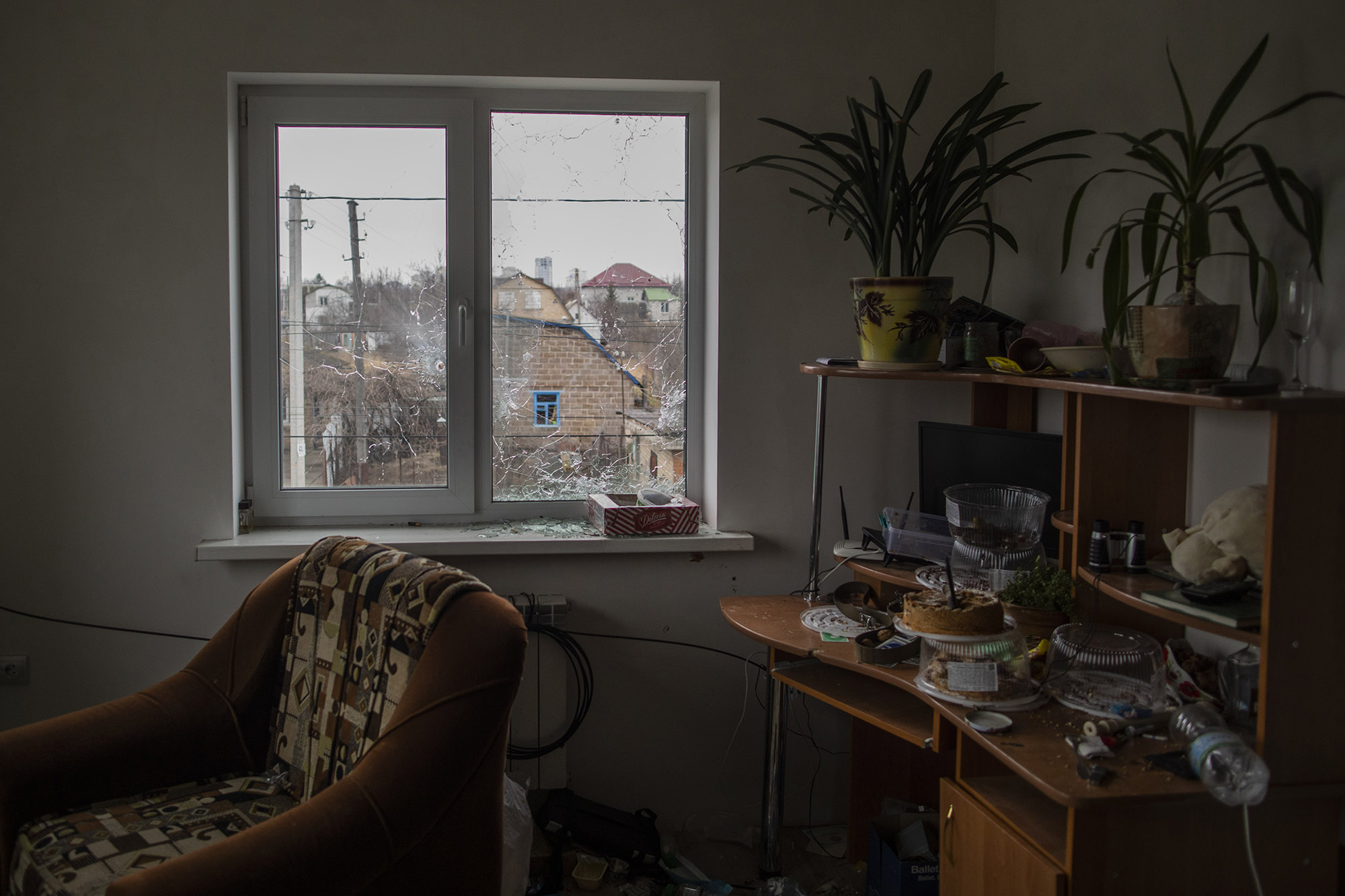 Esta es una vivienda en la calle Yablunska ocupada por soldados rusos durante varios días. Es una casa de dos plantas; un vecino nos indicó que en esta habitación del piso de arriba habían roto el cristal de la ventana para colocar una ametralladora. La casa estaba destrozada, como todas las que habían sido ocupadas.