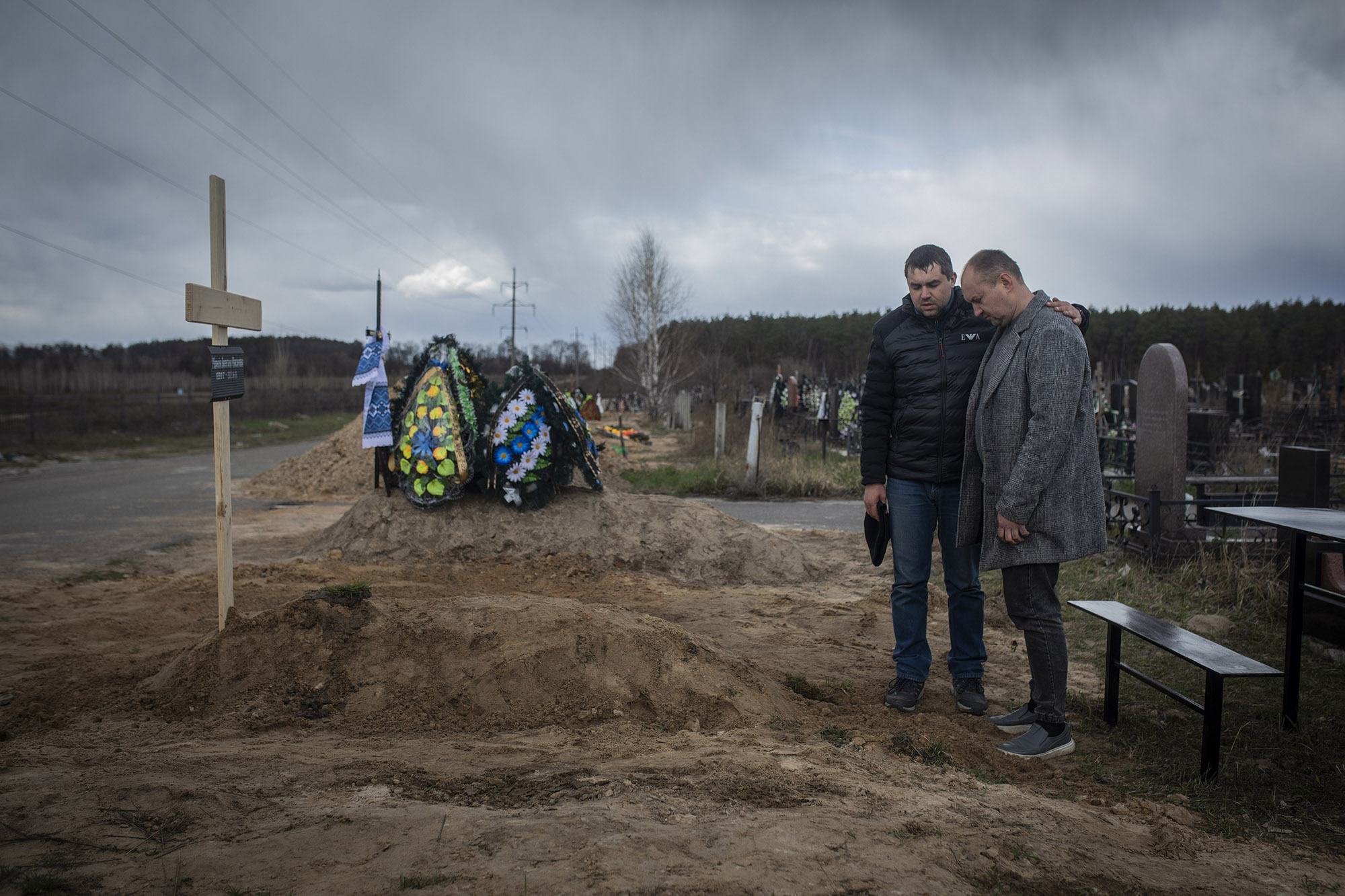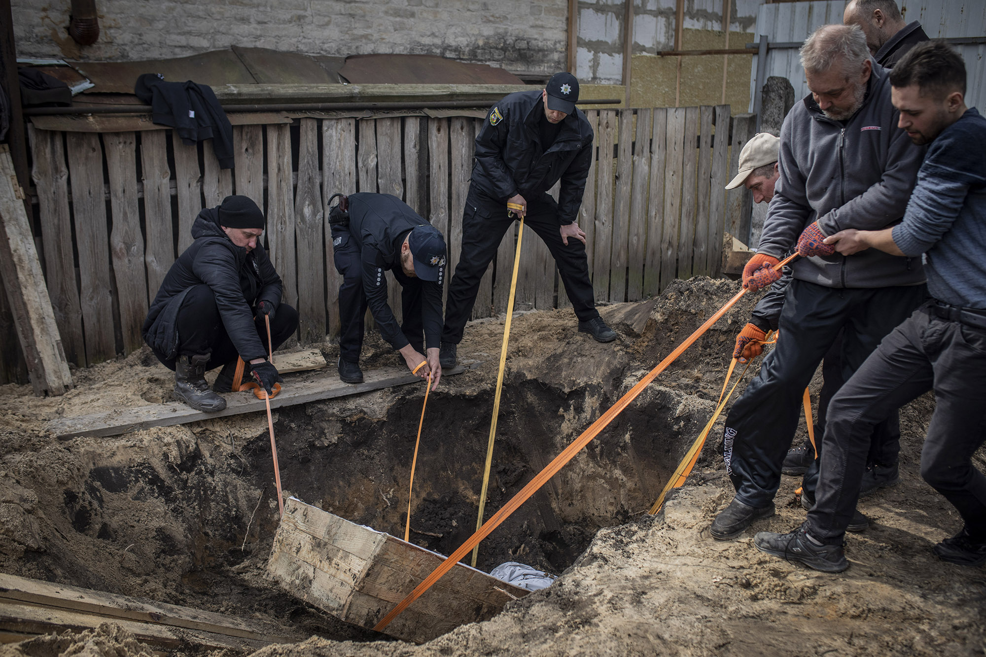 En estas dos imágenes vemos a Valeriy —junto a su hijo Andriy, otros familiares y amigos y agentes policiales— desenterrando el ataúd con el cuerpo de su hijo mayor, Oleksiy, que murió por un disparo en el centro de Bucha el 12 de marzo. Al ver que tras salir a encontrarse con una persona que iba a ser evacuada Oleksiy no volvía a casa, salieron a buscarlo. Aquella noche no pudieron ir más allá de los alrededores de la vivienda por la presencia de las tropas rusas.