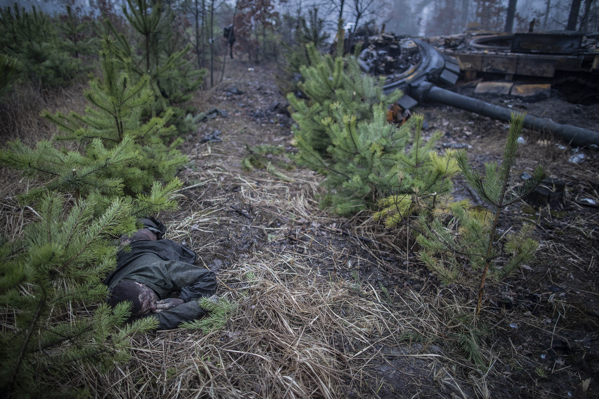 Antes de poder entrar en Irpín y Bucha tras la retirada rusa, lo primero que nos encontramos el 1 de abril fue una columna de tanques rusos destrozados en Dmitrovka. Junto a los tanques todavía había cadáveres de muchos soldados rusos que habían muerto en el ataque.