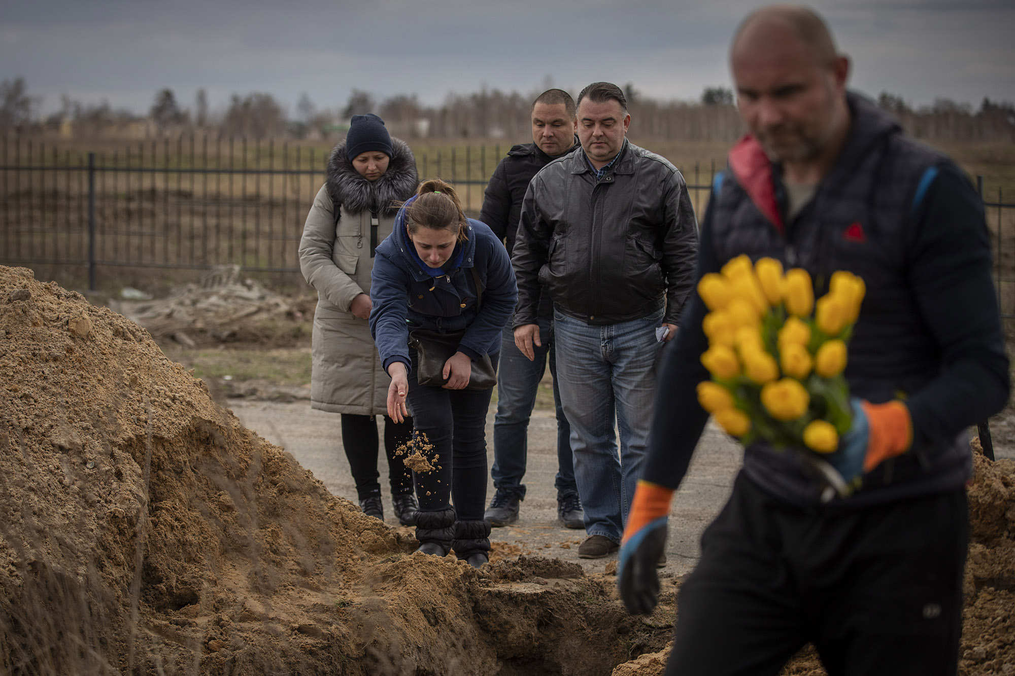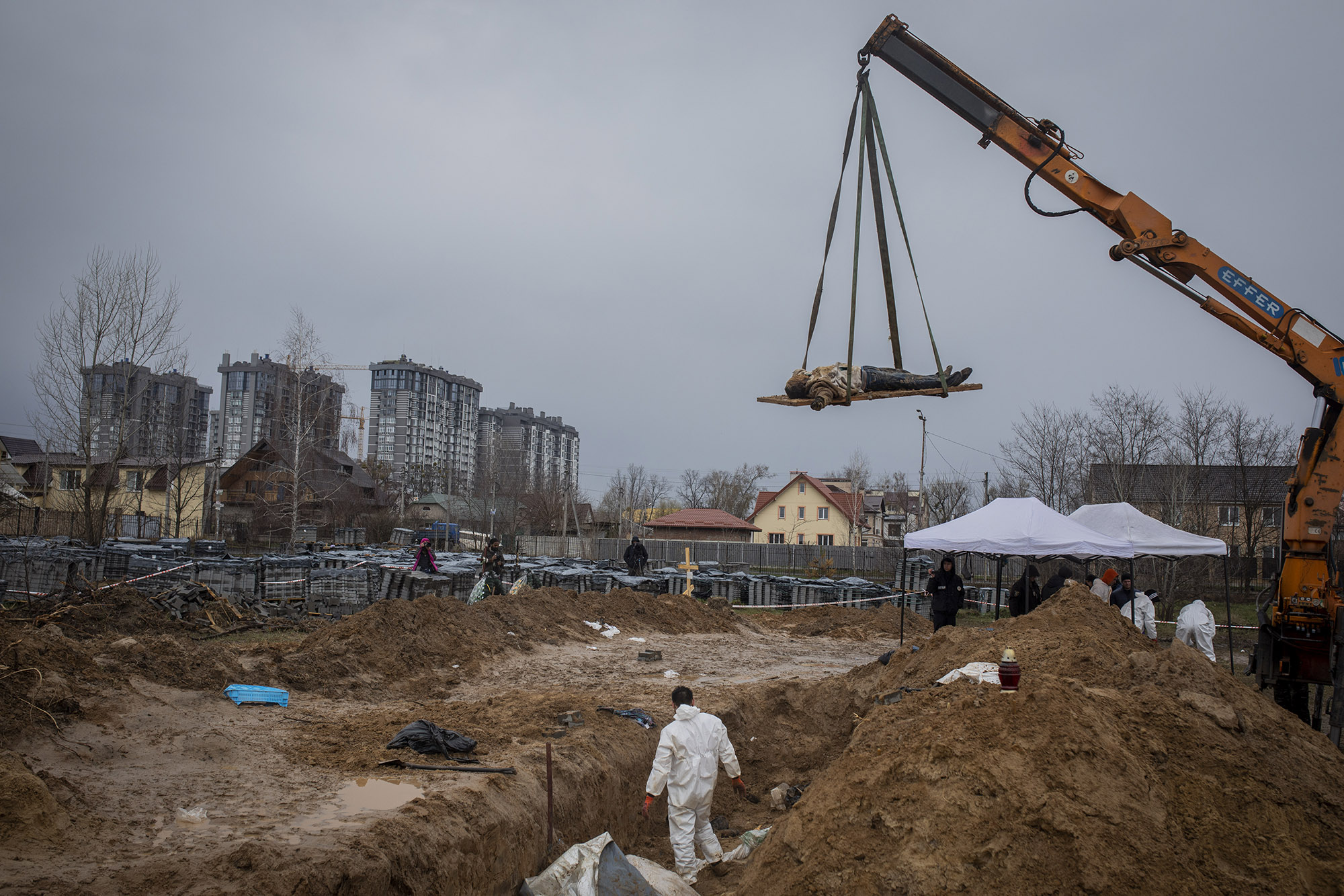 Esta es la fosa común que hay junto a la iglesia de Saint Andrew de Bucha, abierta a principios de marzo. Trabajadores del cementerio autorizados puntualmente por las tropas rusas fueron trayendo aquí cuerpos sin identificar durante las semanas de ocupación.