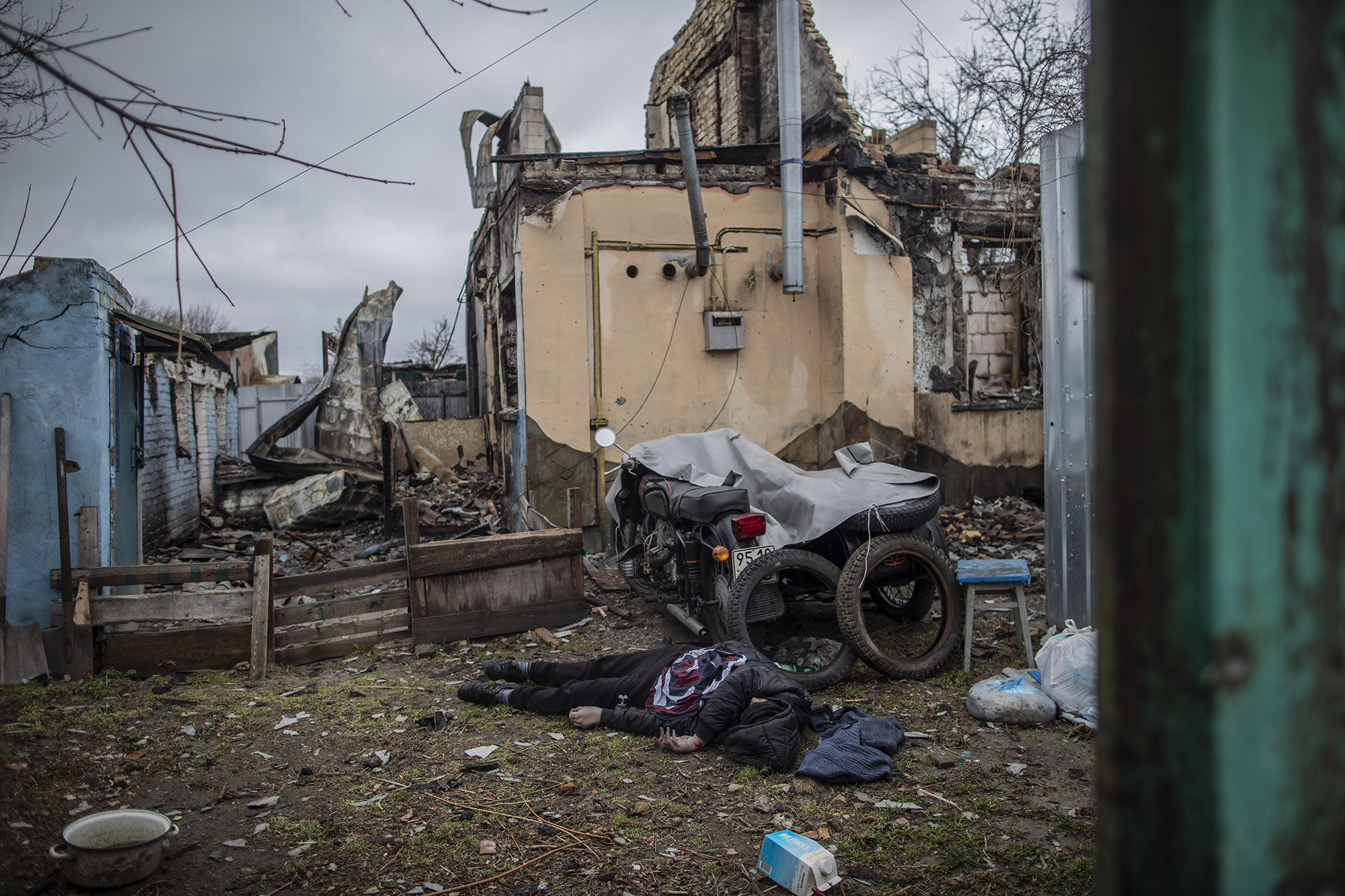 Esta es la esquina entre la calle Yablunska y la calle Vokzalna. La fotografía es del 2 de abril, cuando había muertos por todas partes: también en el jardín de esta casa, bombardeada y destrozada.