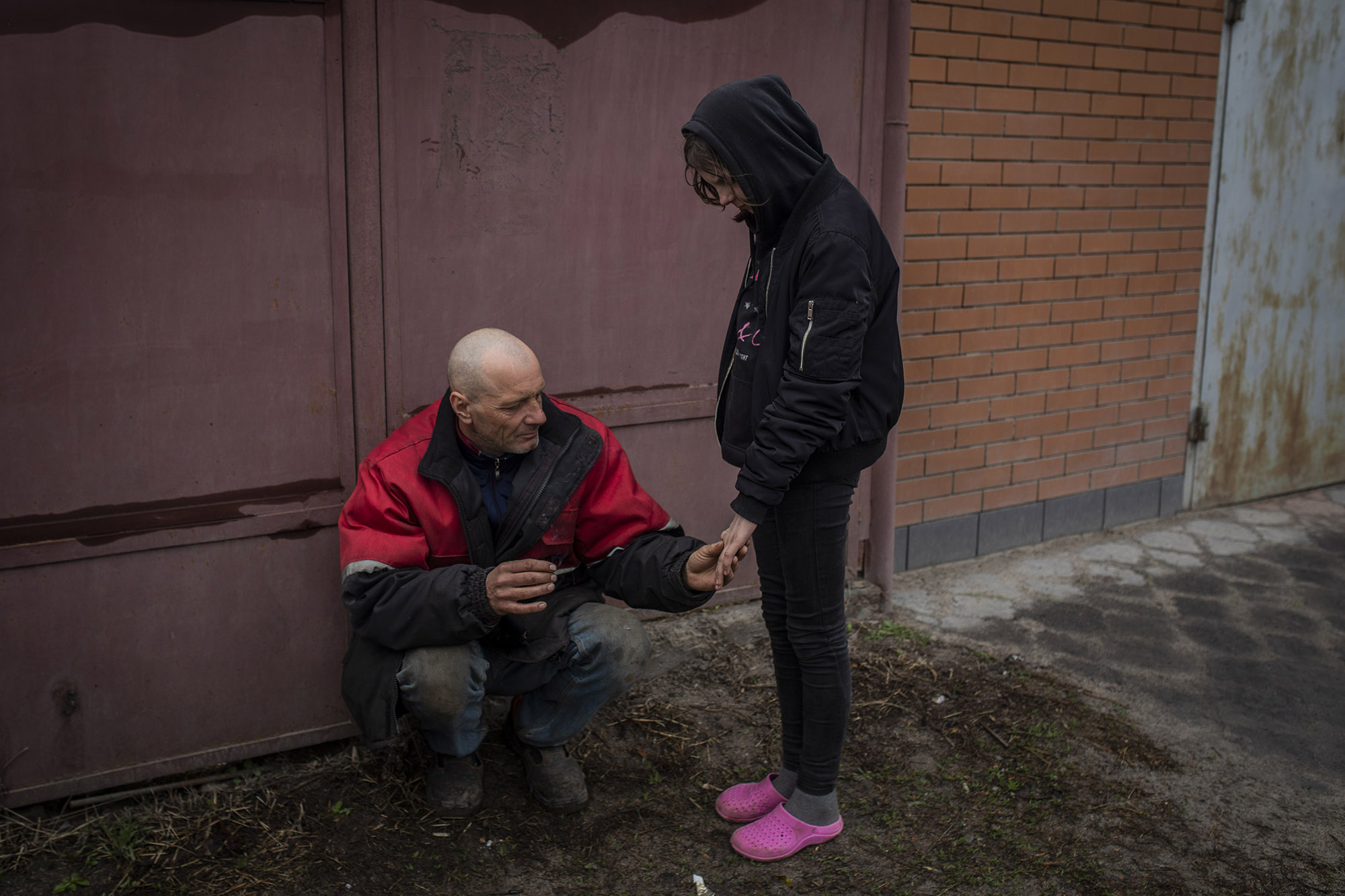 En esta foto del 10 de abril vemos a Sergiy, de 47 años, agarrando la mano de su hija Ruslana, de 10, en la puerta de su casa en la calle Yablunska. Lo había conocido el 3 de abril, cuando salió para contarme cómo habían vivido las semanas de ocupación. Insistía en el miedo que habían pasado por los constantes bombardeos.