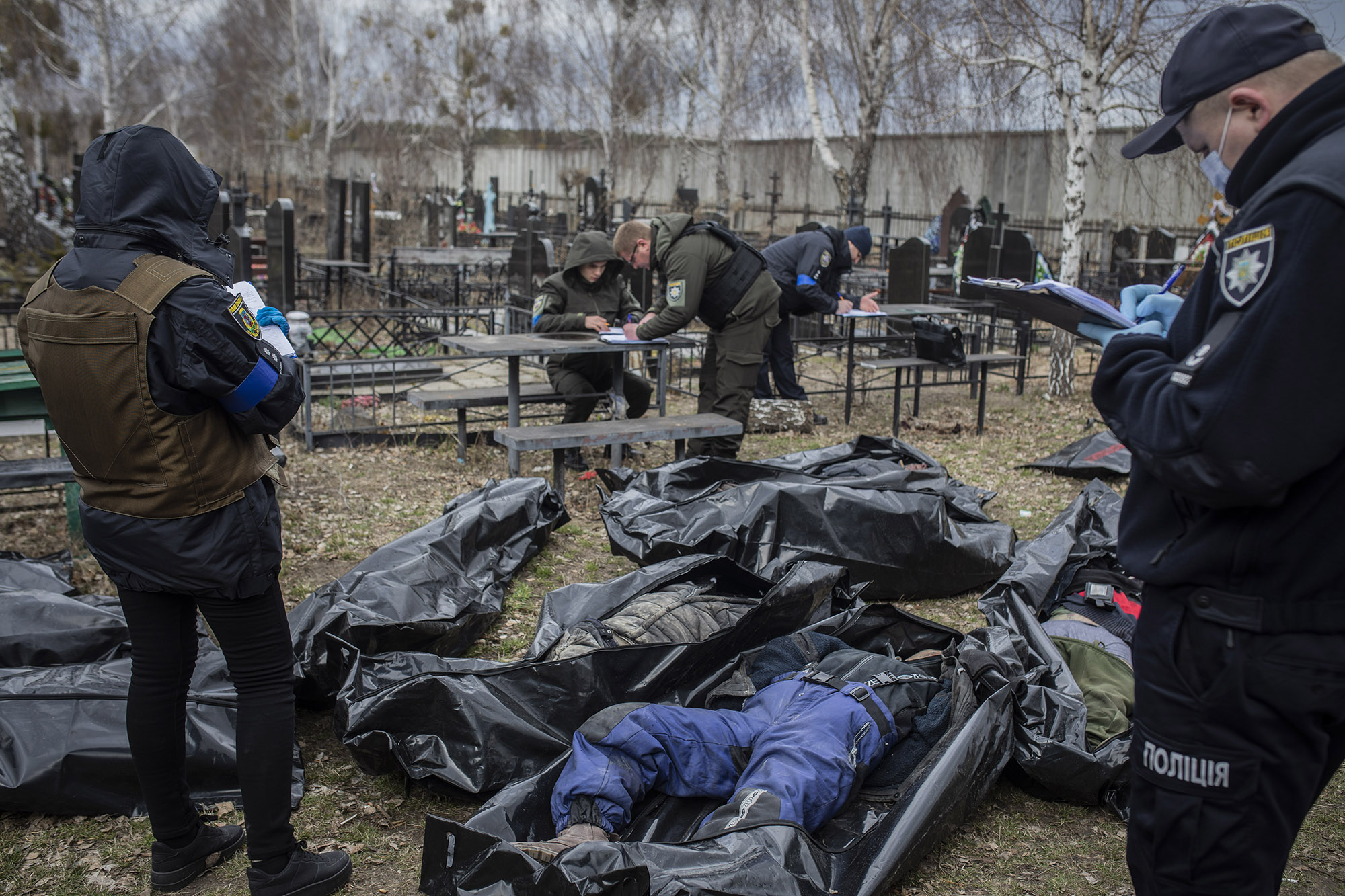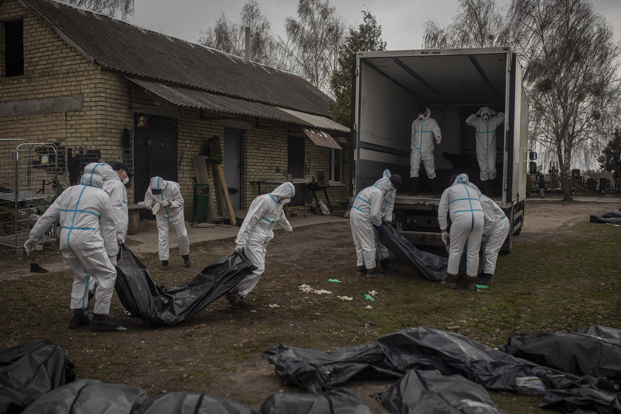 Un grupo de voluntarios enfundados en trajes de protección recogió 65 cadáveres del cementerio número 3 de Bucha el 12 de abril. De allí los trasladaron a la morgue.