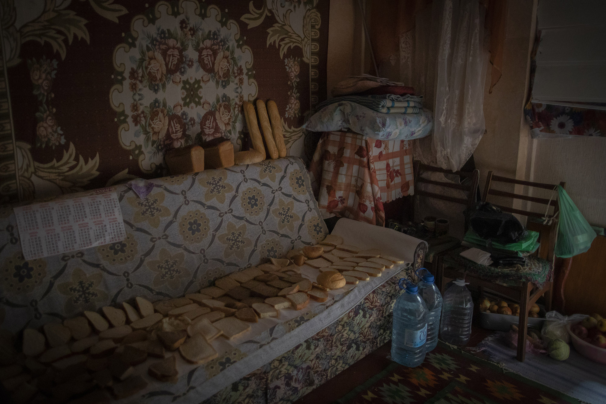 Lidiia Borysenko, de 74 años, ha pasado toda la ocupación en su casa. Ahora mismo, como muchos, está sin electricidad. En la vivienda hace mucho frío. En la sala de estar seca el pan para almacenarlo. Cuenta que en el sótano tenía productos como patatas, zanahorias y fruta que le permitieron alimentarse durante la ocupación, pero le faltaban muchos otros como pan, carne o leche. Ahora dice tener más que suficiente.