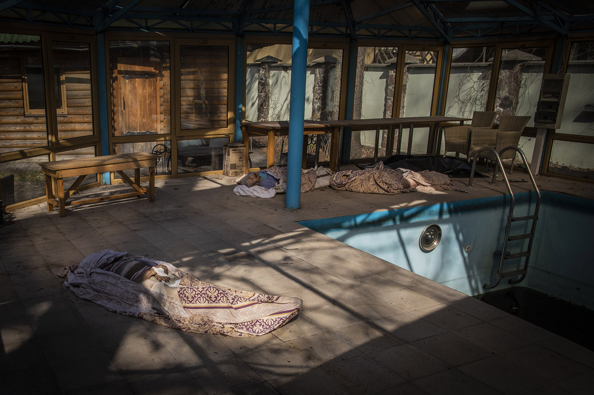El pasado 7 de abril fuimos a una residencia de ancianos en la que había seis personas mayores muertas. Cuatro de los cuerpos estaban al lado de una piscina cubierta en el jardín de la residencia, que era un chalet alejado del centro de Bucha. El cuerpo de una quinta persona estaba en el jardín, y el de un sexto anciano estaba en la cama de una de las habitaciones.