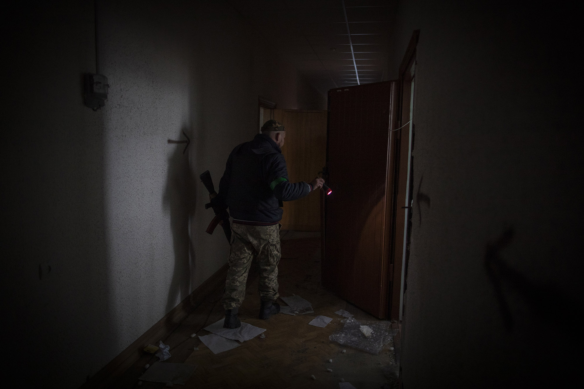En la imagen vemos a un miembro de las fuerzas de defensa territorial caminando por el interior del edificio aún sin luz, como el resto de Bucha. El lugar está como casi todas las viviendas en las que han entrado soldados rusos: parecía como si tuvieran órdenes de destrozarlo todo. Estaba lleno de basura, con todo revuelto, destrozado, y botellas de alcohol por todas partes.