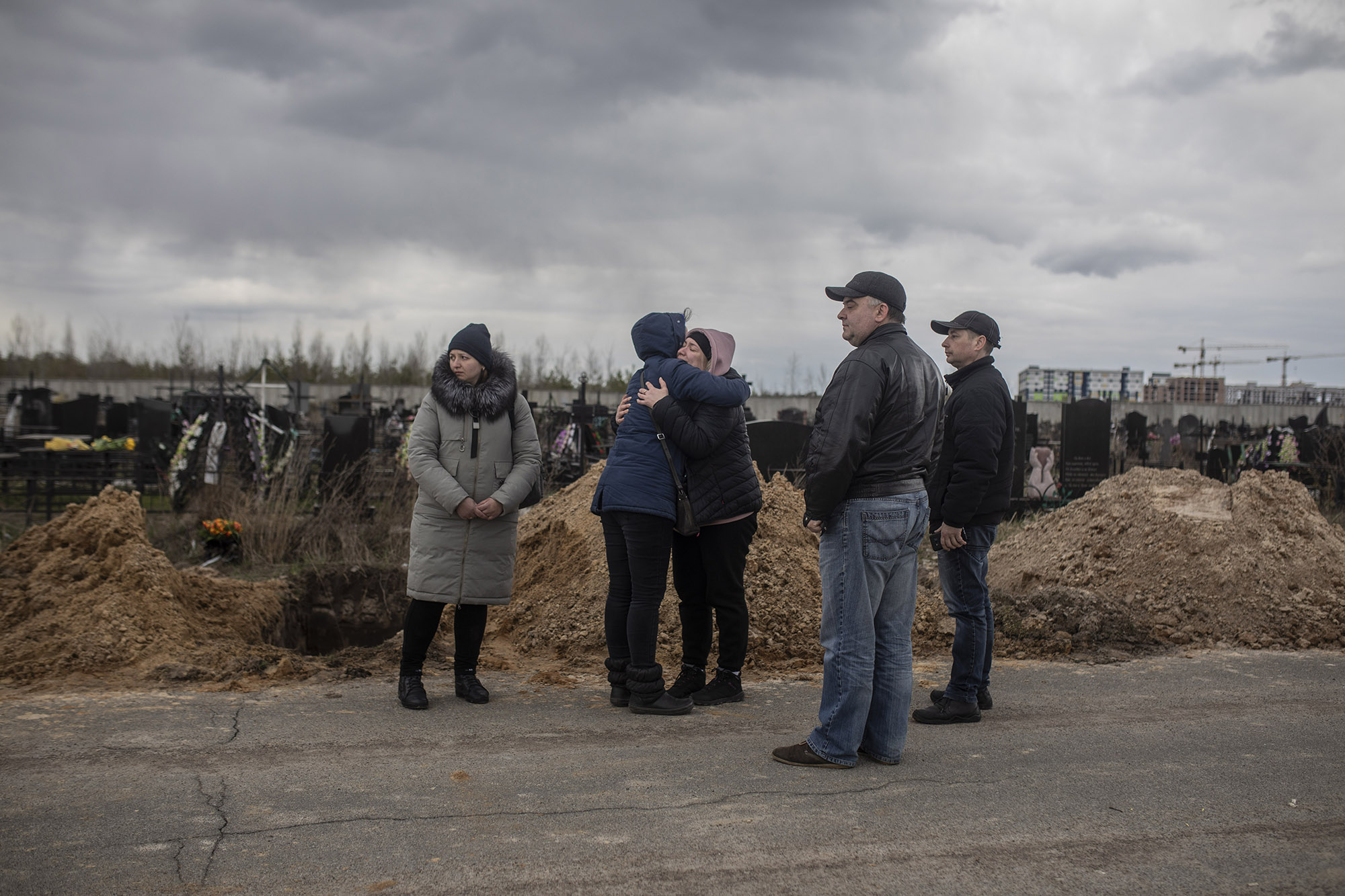 La novia y la tía de Andriy se abrazan, nada más enterrarlo, el 11 de abril.