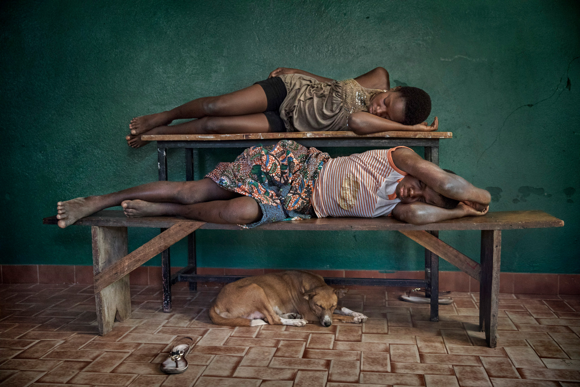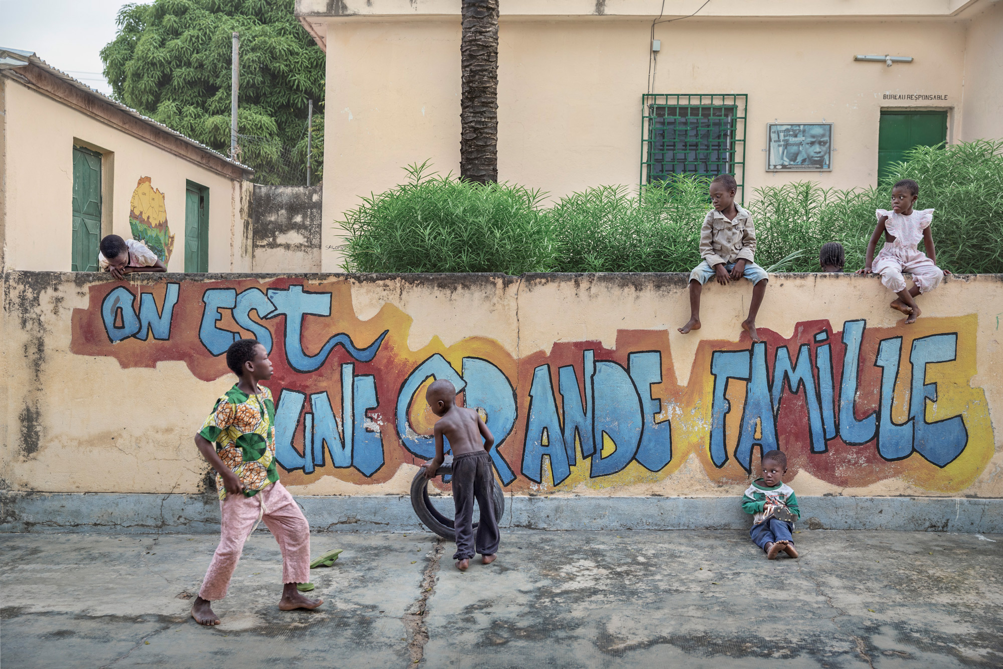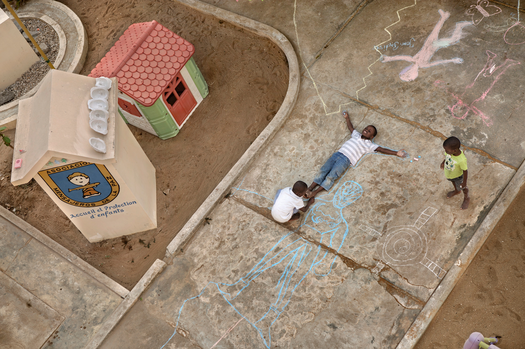 En esta foto, Justin dibuja con tiza la silueta de Indigo. Ambos se conocieron en Cotonú (Benín), en el Centro de la Alegría de Mensajeros de la Paz -una de las oenegés con las que he trabajado, además de Carmelitas Vedruna y Misiones Salesianas-. Los dos niños se hicieron muy amigos, aunque puede que no se vuelvan a ver. En el momento en que hice esta fotografía faltaban pocos días para que Indigo fuera reintegrado a su familia, que ya lo daba por perdido. Años atrás, su padre había confiado en un amigo para que llevara al pequeño a vivir con sus hermanos mayores, pero por el camino el hombre lo vendió a una comerciante de telas. Indigo se escapó y estuvo vagando por las calles hasta que alguien lo entregó a la policía.