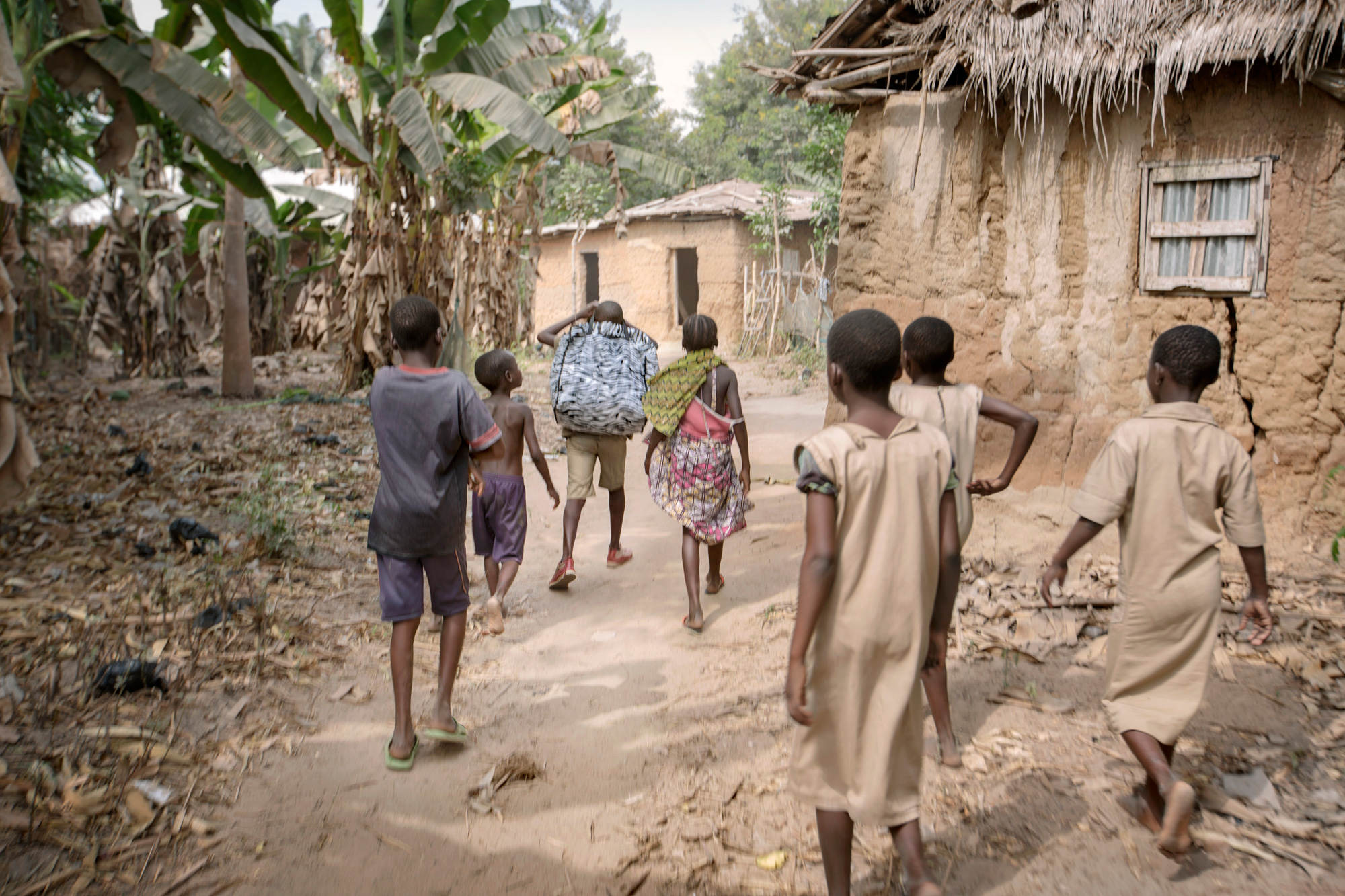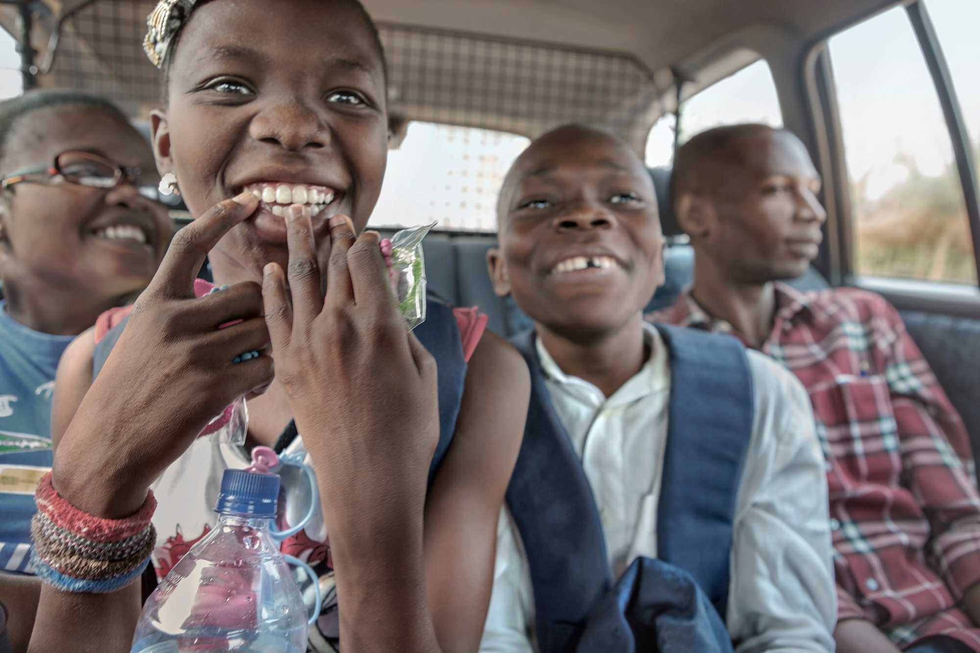 Esta foto está hecha en el trayecto del retorno a casa después de un tiempo en un centro de acogida. Es el momento exacto en que Lavande y Marron ven por primera vez la entrada de su pueblo, Sedje Denou (Benín), desde el coche. Ese primer segundo en el que ven de nuevo sus casas es sobrecogedor. Empiezan a reconocer la aldea, a ver cómo los niños salen corriendo hacia ellos. La última vez que salieron de aquí no sabían que acabarían siendo vendidos como esclavos en Nigeria.